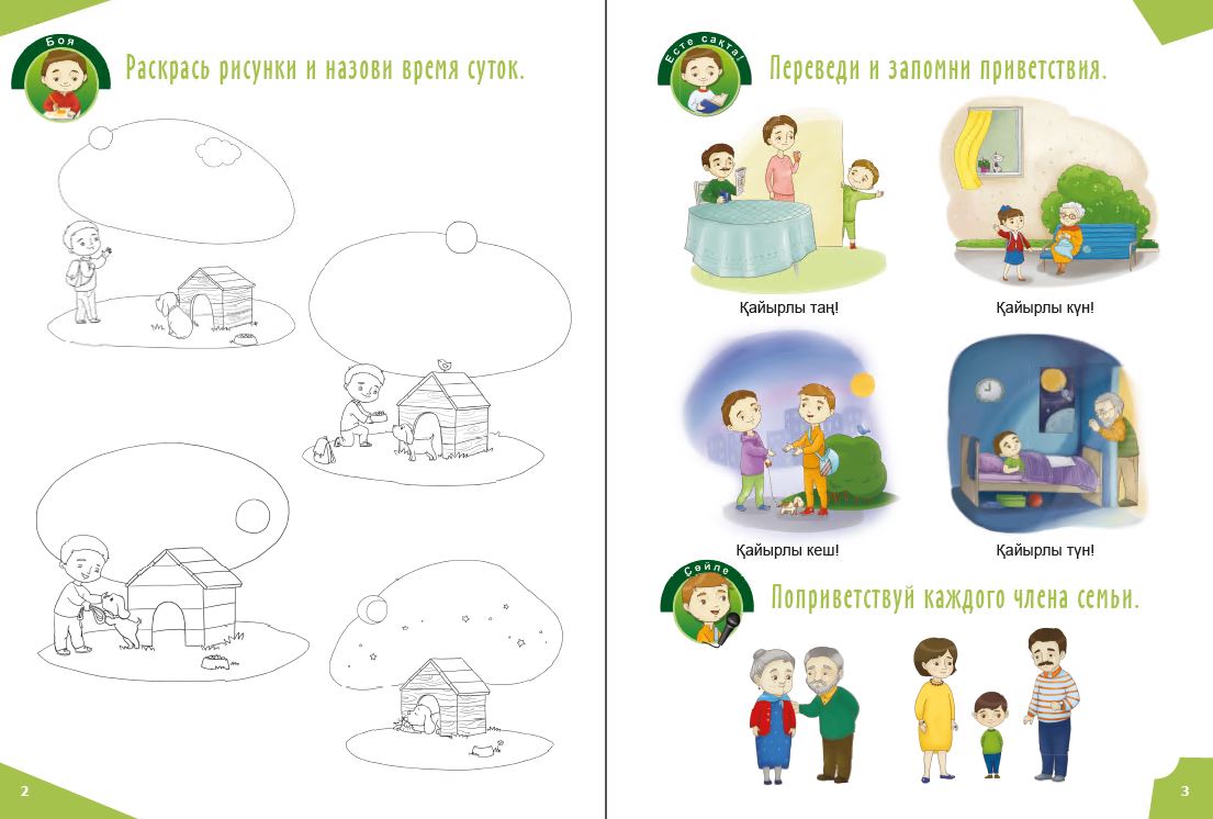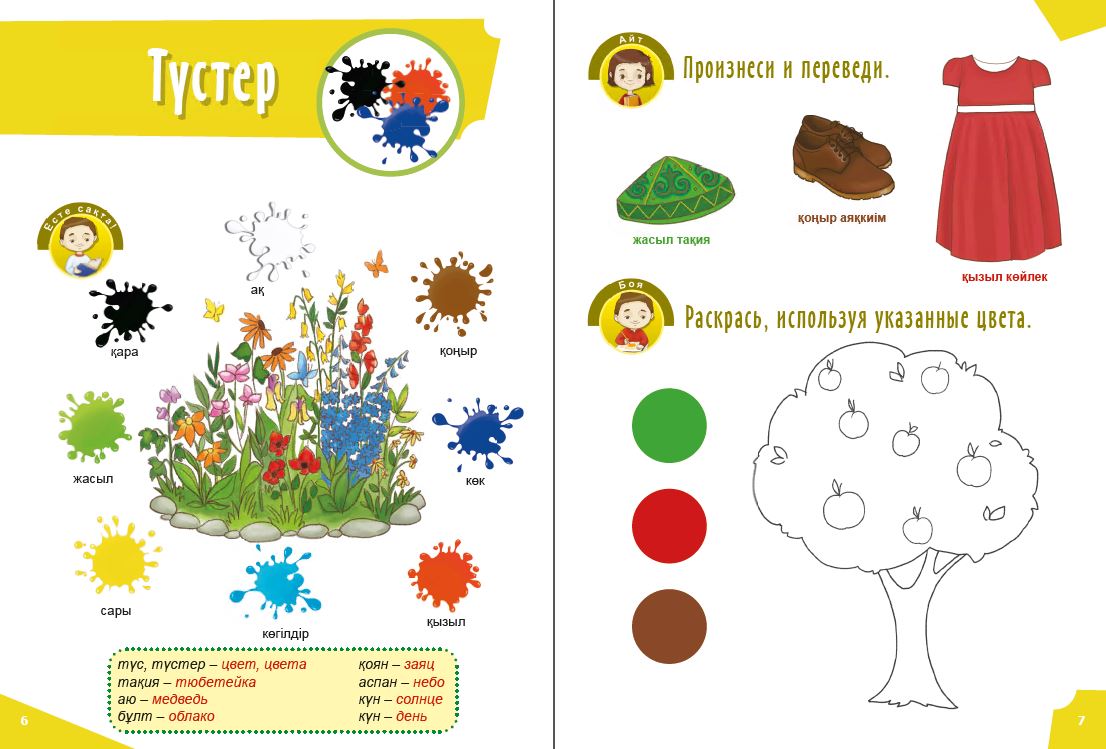 Лексическое наполнение пособия охватывает 16 тем, освоив которые, ребёнок начнёт активно использовать в своей речи 158 казахских слов.