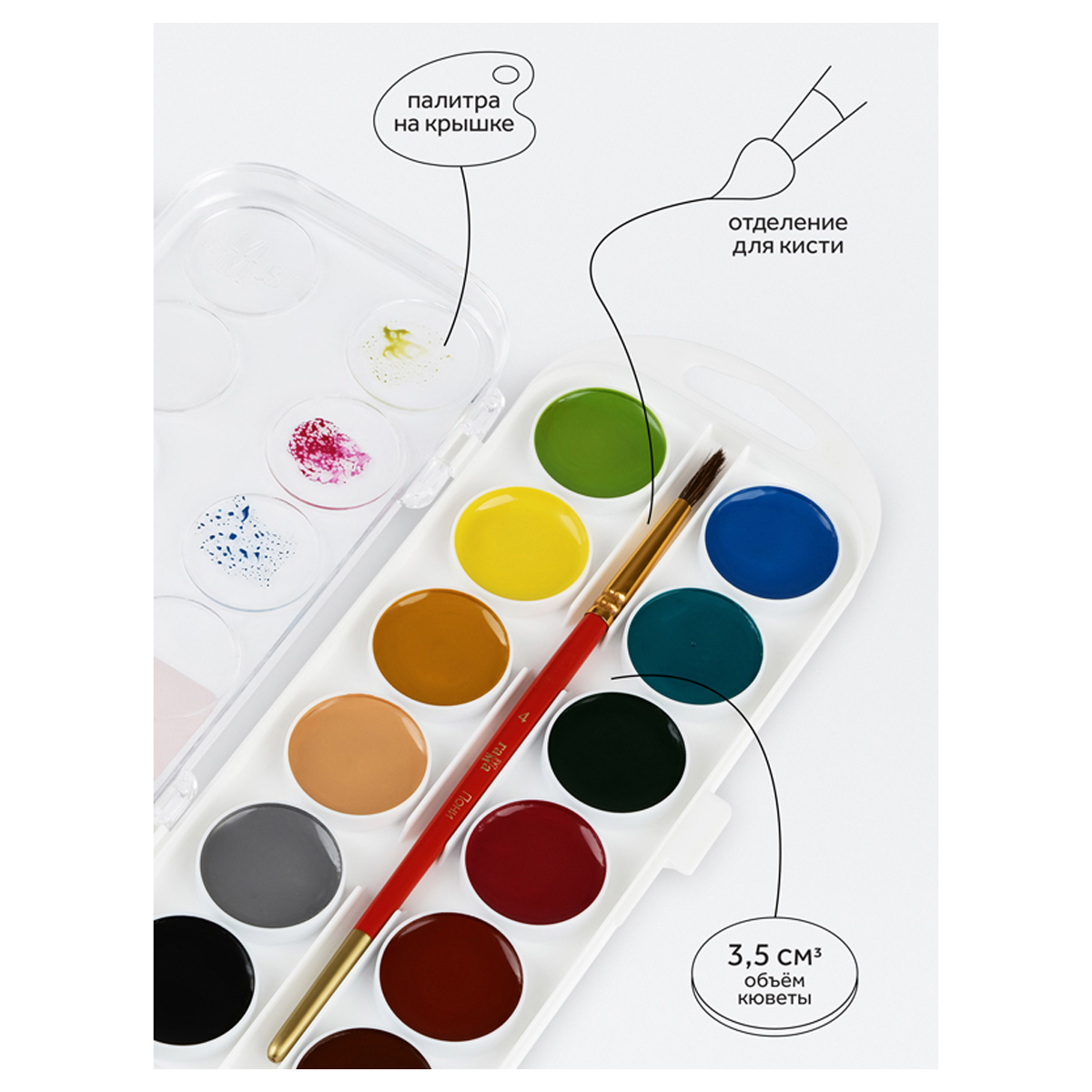 Медовая акварель серии "Мультики" разработана с учетом рекомендаций педагогов. Идеально подходит для занятий рисованием в детском саду, школе и дома. Яркие чистые цвета развивают фантазию и интерес к творчеству. Акварель безопасна для детей. Удобный пластиковый пенал, крышка плотно фиксируется и служит палитрой для смешивания красок. Кюветы с высокими бортиками и увеличенным расстоянием между красками предназначены для удобства в работе детей. Акварель легко смывается с рук и отстирывается с одежды. Объем кювет - 3,5 см3. Форма кювет - круглая.