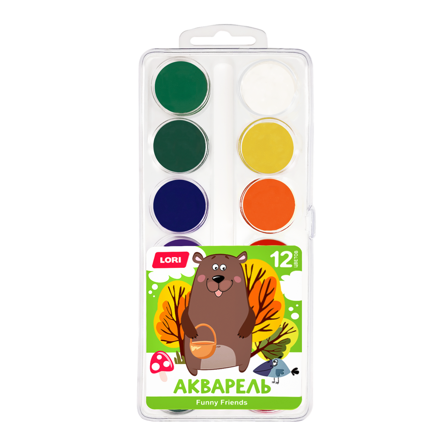 Аквф-002 Акварель FUNNY FRIENDS 12 цв, б/к в пластиковой упаковке с крышкой
