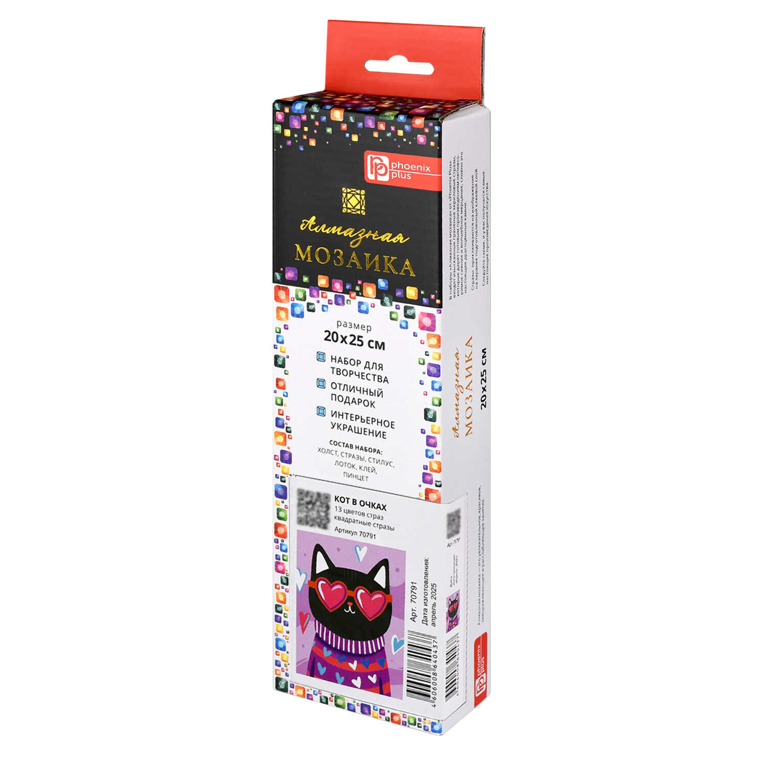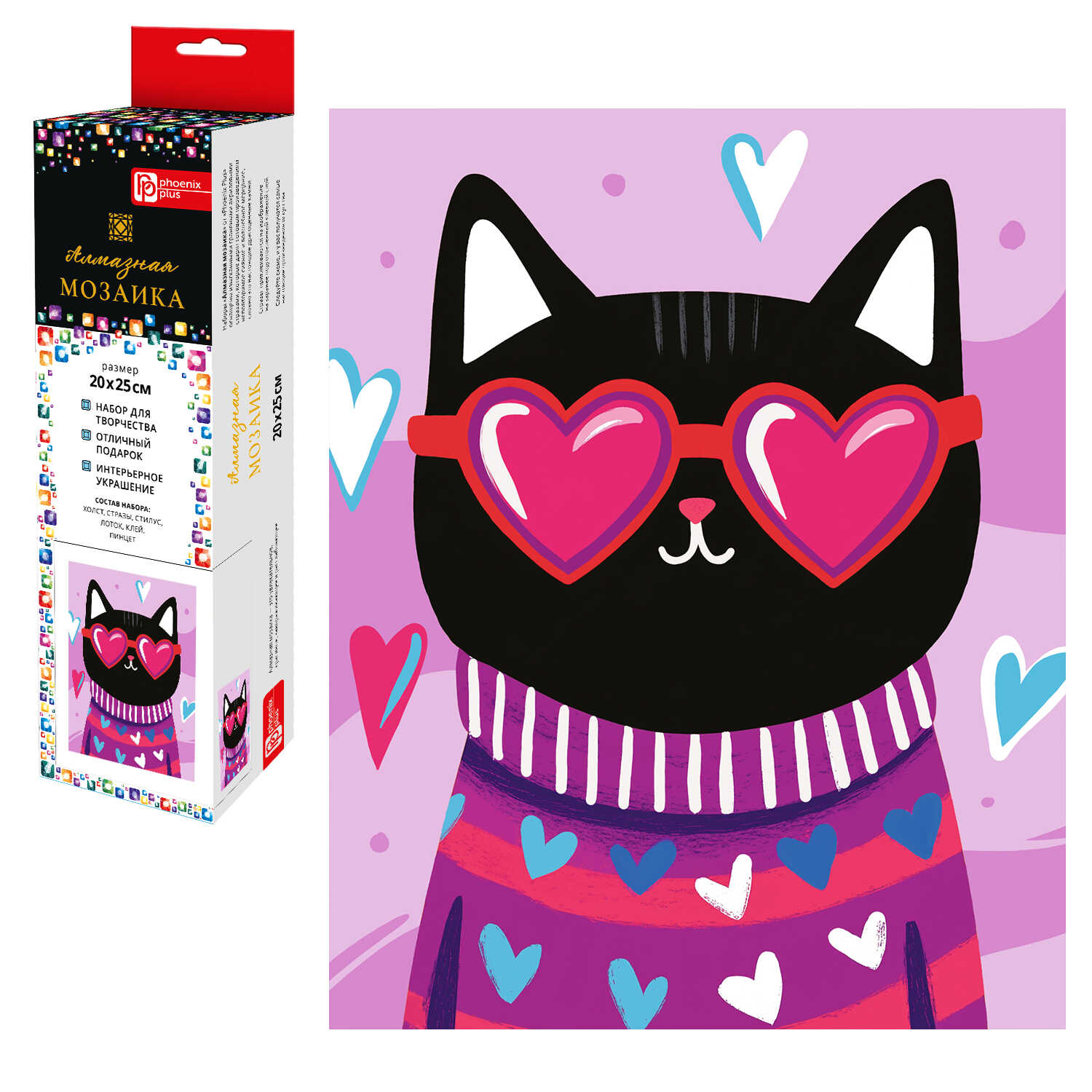 Алмазная мозаика (набор для творчества) арт. 70791 / 50 КОТ В ОЧКАХ, размер: 20x25 см, (13 цветов страз, холст с напечатанной картиной, покрытый клеевым слоем и защитной пленкой, пакеты со стразами, стилус, лоток для страз, силикон для страз, клей, пинцет металлический, схема, дополнительные пакеты с zip-молнией, стикеры для нумерации zip-пакетов в комплекте, форма страз: квадратная, тип выкладки: полная, картонная коробка с европодвесом)