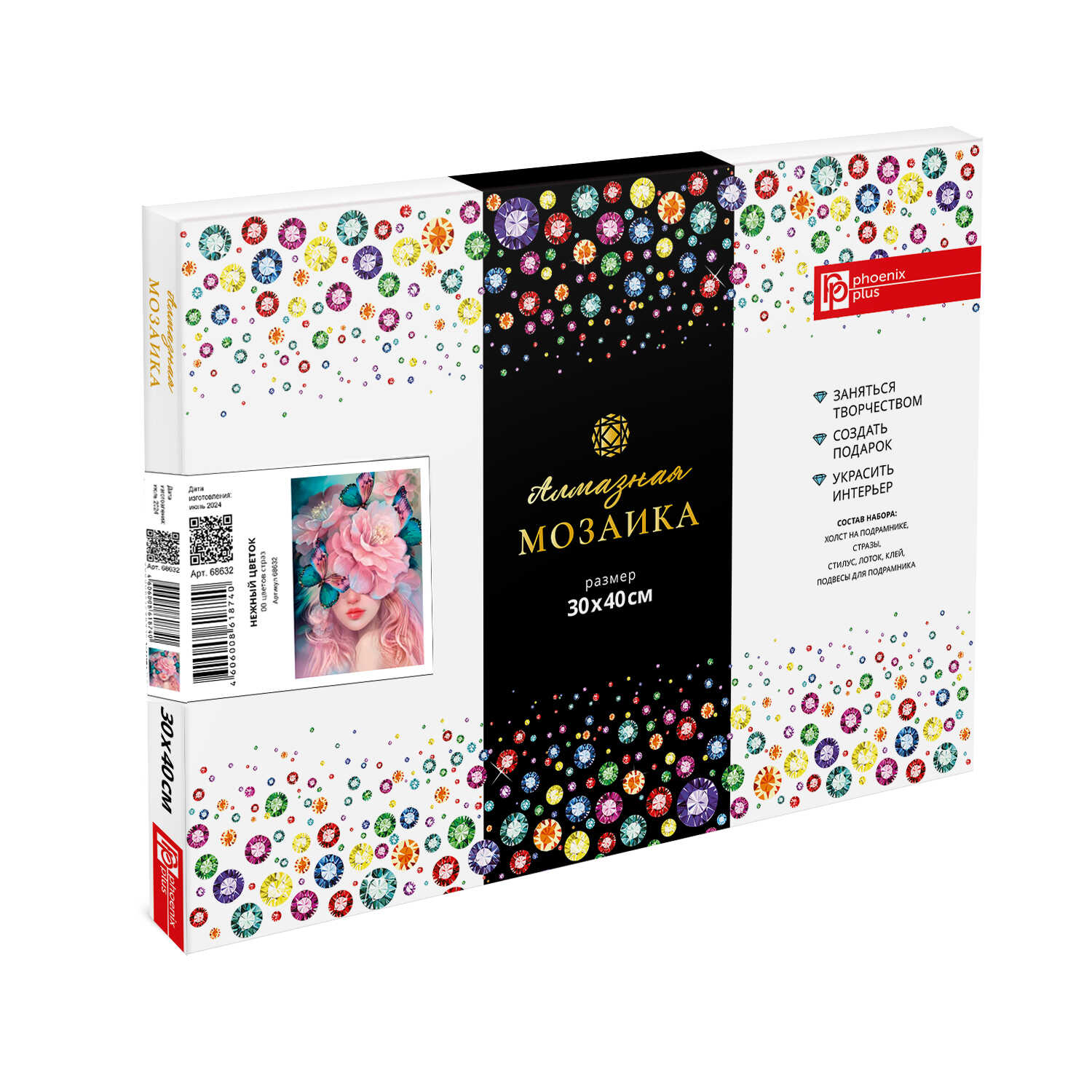 Алмазная мозаика (набор для творчества) арт. 68632 / 25 НЕЖНЫЙ ЦВЕТОК, размер: 30*40 см, (20 цветов страз, холст на подрамнике с напечатанной картиной, покрытый клеевым слоем и защитной пленкой, пакеты со стразами, стилус, лоток для страз, силикон для страз, клей, подвесы для подрамника, пинцет металлический, схема, дополнительные пакеты с zip-молнией, стикеры для нумерации zip-пакетов в комплекте, форма страз: круглая, тип выкладки: полная, картонная коробка)