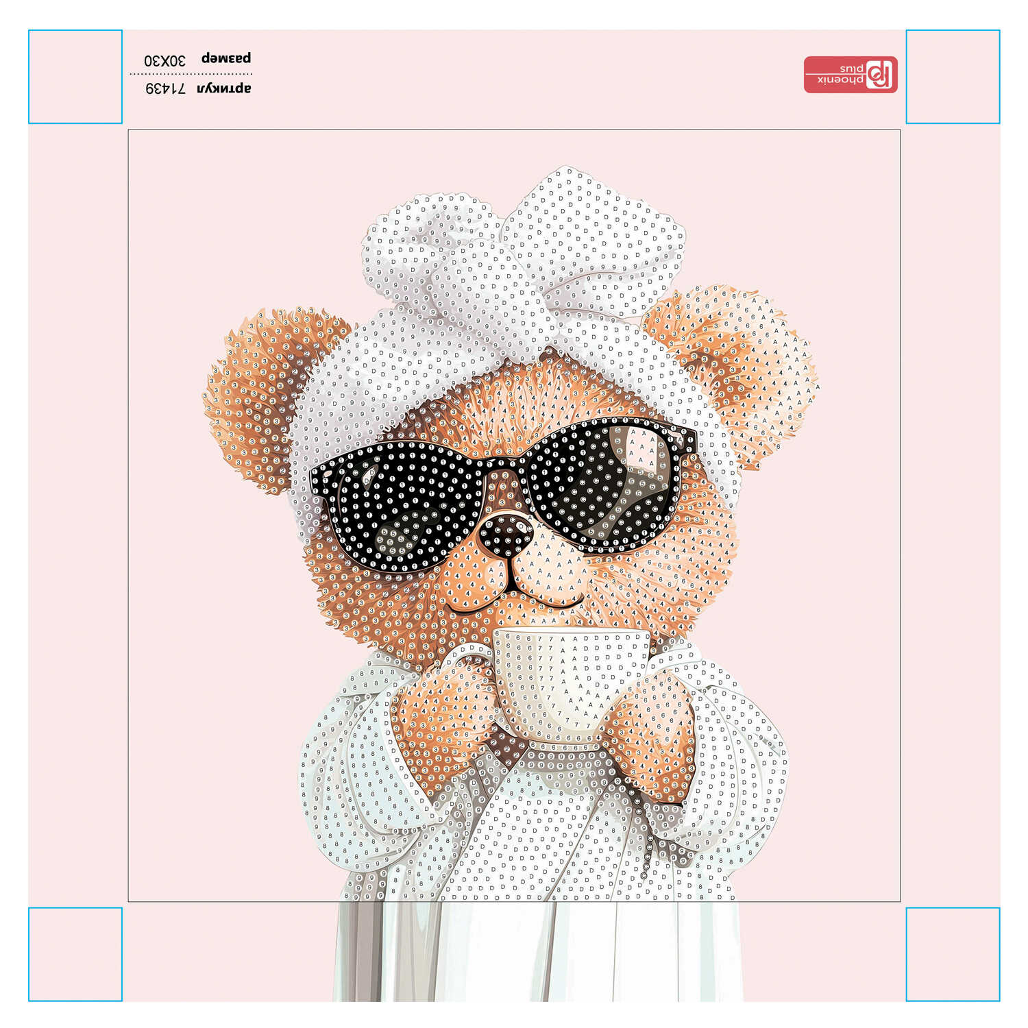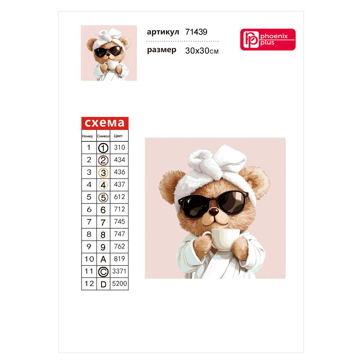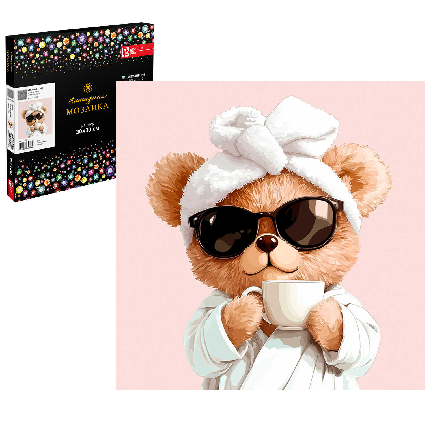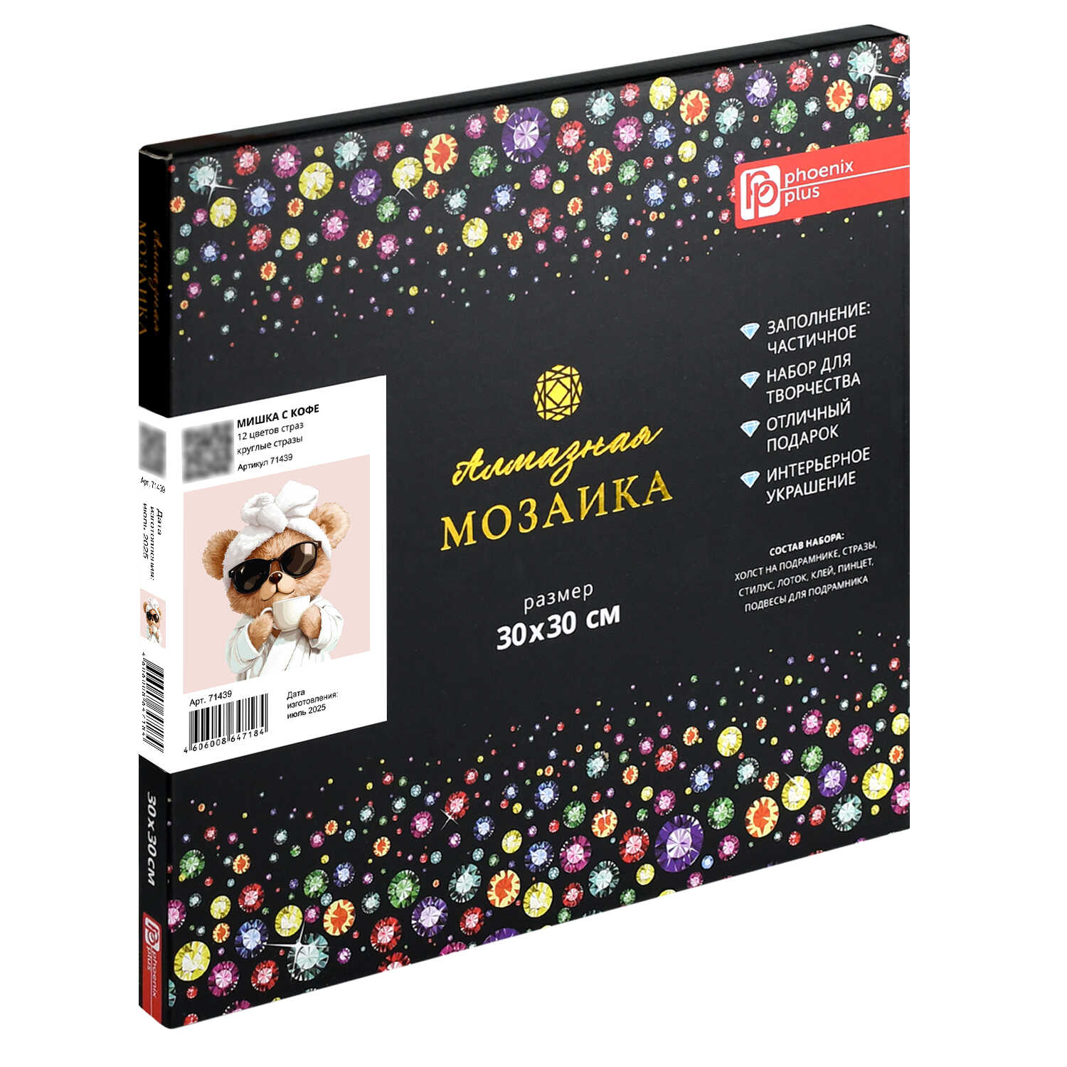 Алмазная мозаика с частичной выкладкой (набор для творчества) арт. 71439 / 25 МИШКА С КОФЕ, размер: 30*30 см, (12 цветов страз, холст на подрамнике с напечатанной картиной, покрытый клеевым слоем и защитной пленкой, пакеты со стразами, стилус, лоток для страз, силикон для страз, клей, подвесы для подрамника, пинцет металлический, схема, дополнительные пакеты с zip-молнией, стикеры для нумерации zip-пакетов в комплекте, форма страз: круглая, тип выкладки: частичная, картонная коробка)