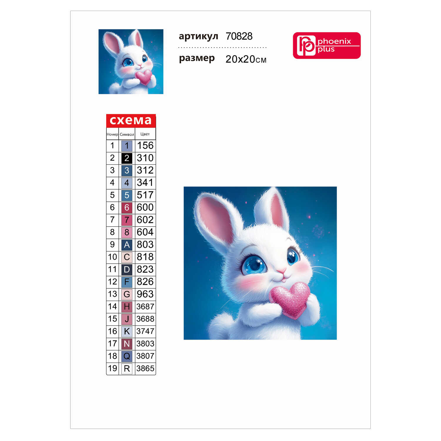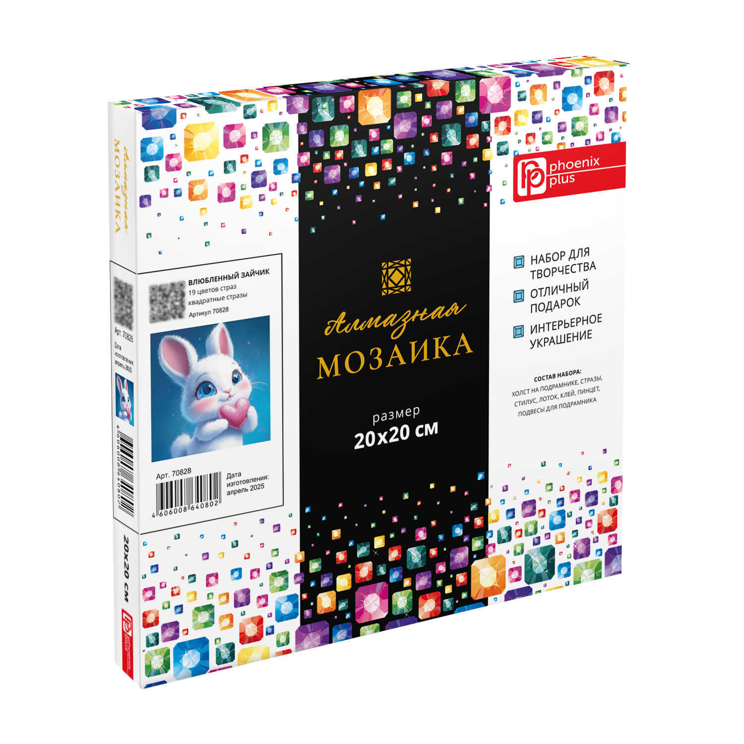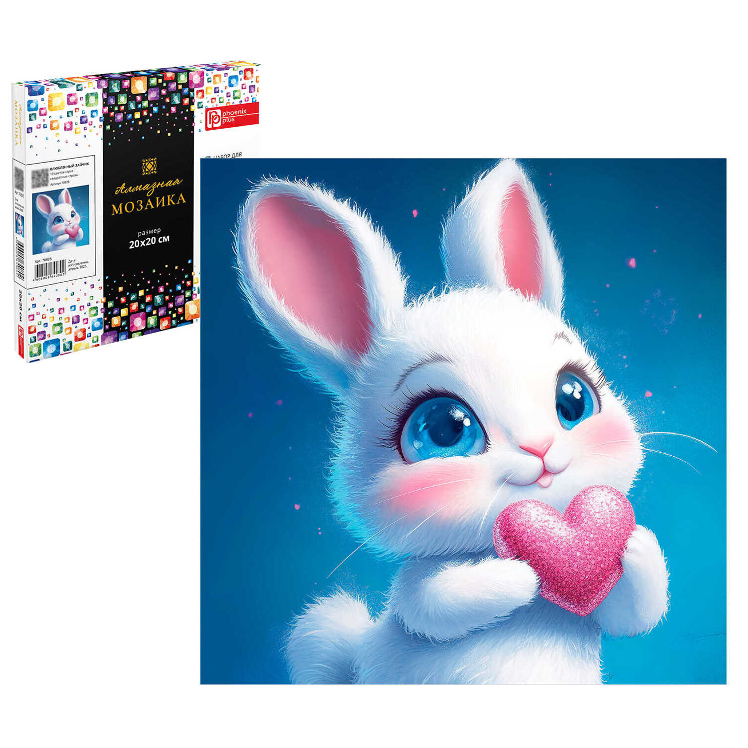 Алмазная мозаика (набор для творчества) арт. 70828 / 60 ВЛЮБЛЕННЫЙ ЗАЙЧИК, размер: 20x20 см, (19 цветов страз, холст на подрамнике с напечатанной картиной, покрытый клеевым слоем и защитной пленкой, пакеты со стразами, стилус, лоток для страз, силикон для страз, клей, подвесы для подрамника, пинцет металлический, схема, дополнительные пакеты с zip-молнией, стикеры для нумерации zip-пакетов в комплекте, форма страз: квадратная, тип выкладки: полная, картонная коробка)