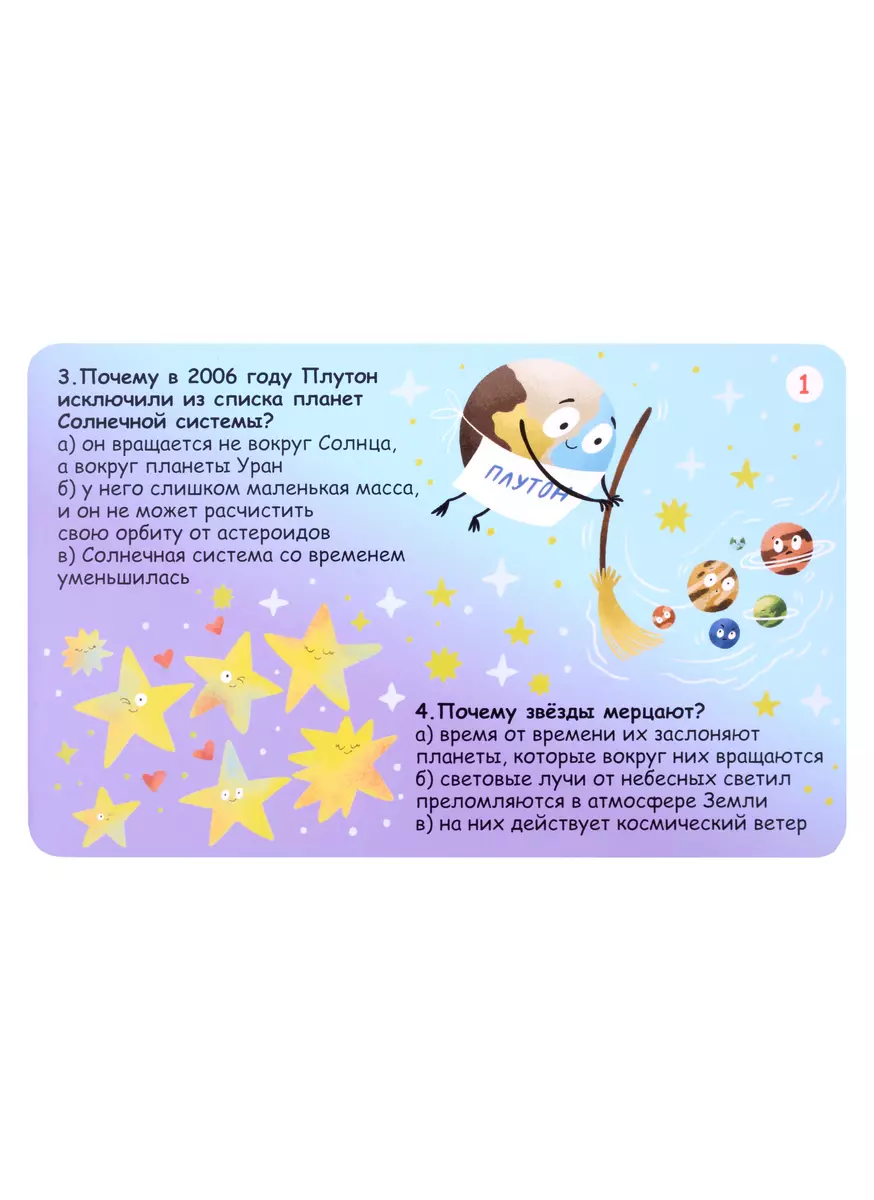Как рождается звезда? Как часто на Землю падают метеориты? Почему Марс красный? Почему у кометы есть хвост? Всегда ли Полярная звезда из созвездия Малая Медведица указывает на север? Почему на МКС невозможно воспользоваться шариковой ручкой для письма? Почему в 2006 году Плутон исключили из списка планет Солнечной системы?