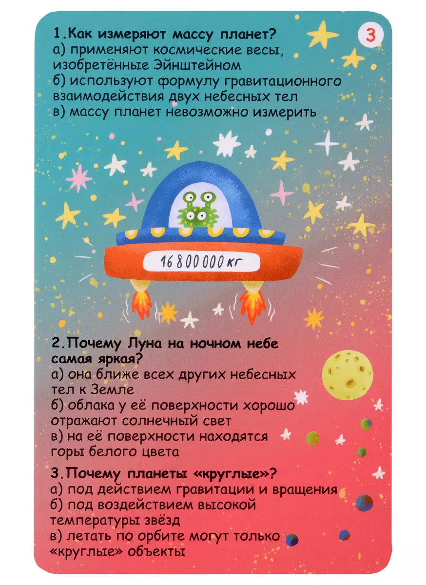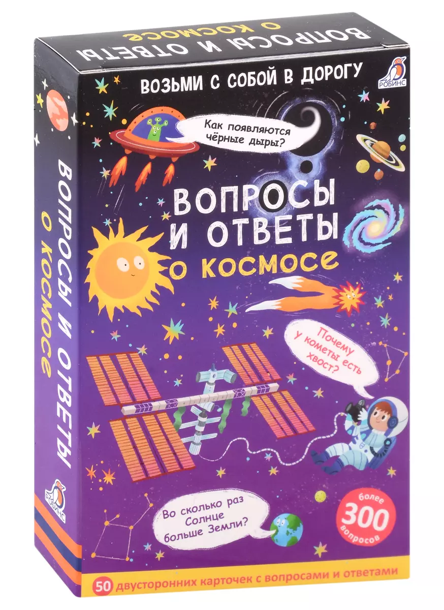 В набор входят 50 двусторонних карточек с вопросами и ответами на самые часто задаваемые и необычные вопросы о космосе. Играя с карточками, ребёнок узнает интересные факты о планетах, звёздах, метеоритах, кометах, а также будет развивать память, внимание, логику, мышление и другие важные навыки.