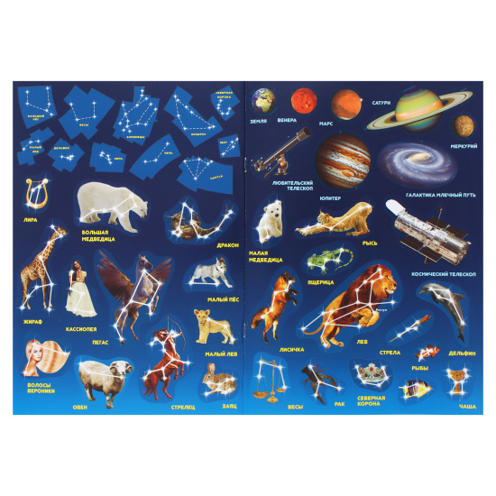 Детский атлас с наклейками "звездное небо" знакомит Вашего малыша с Солнечной системой, способами наблюдения за космосом и более подробно - с созвездиями ночного неба. Здесь созвездия отражены сказочными героями или животными, описаны самые интересные легенды - почему они названы именно так. В процессе интересной игры ребенок может изучить загадочный мир звезд.