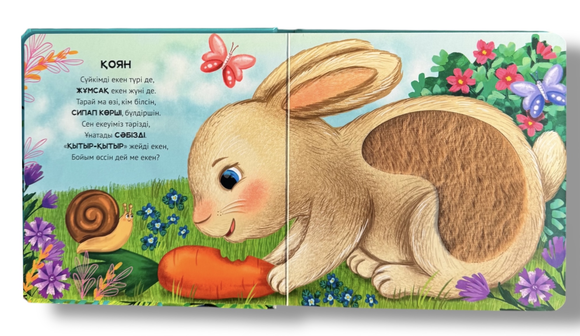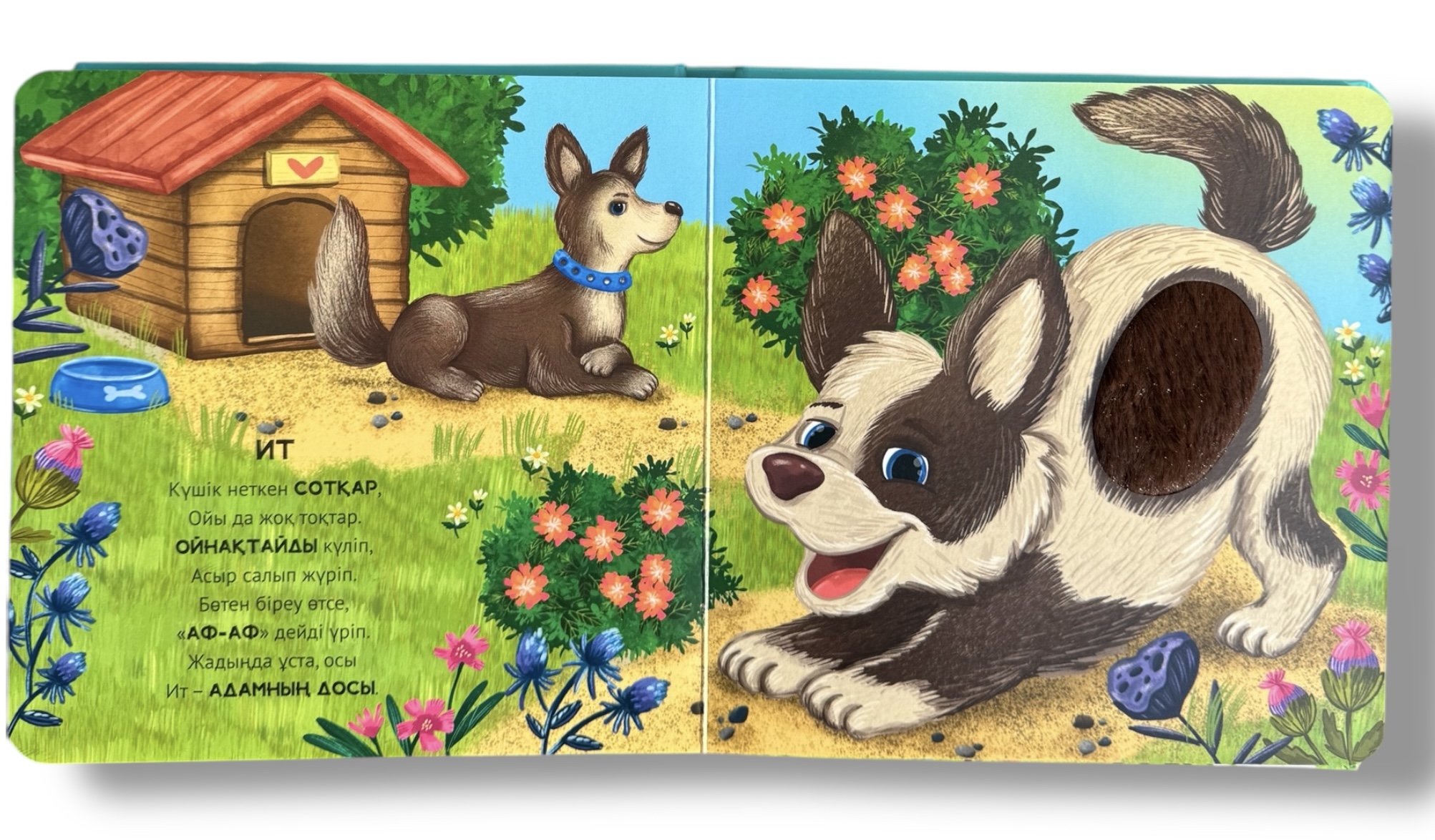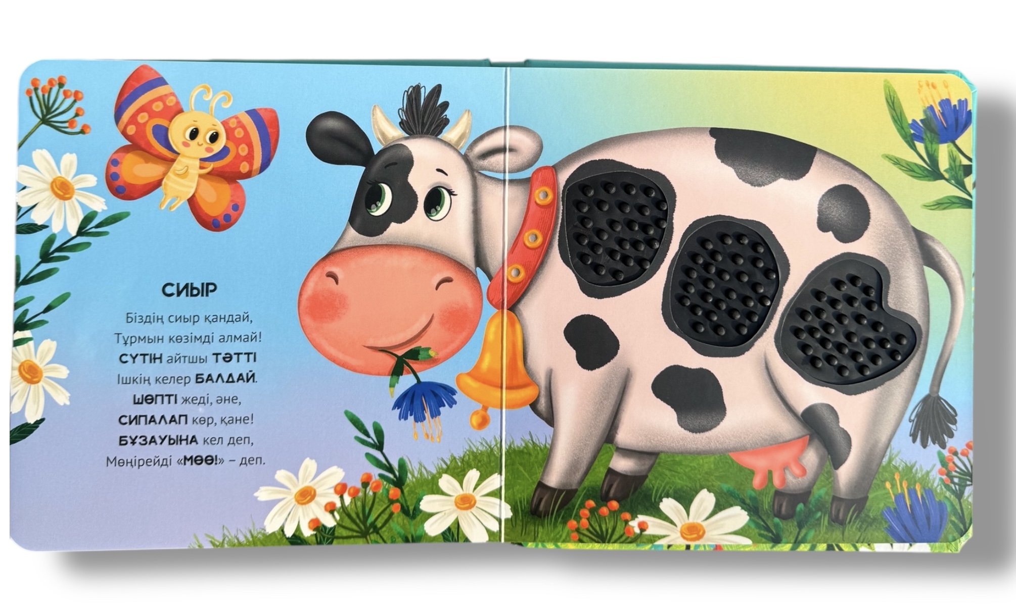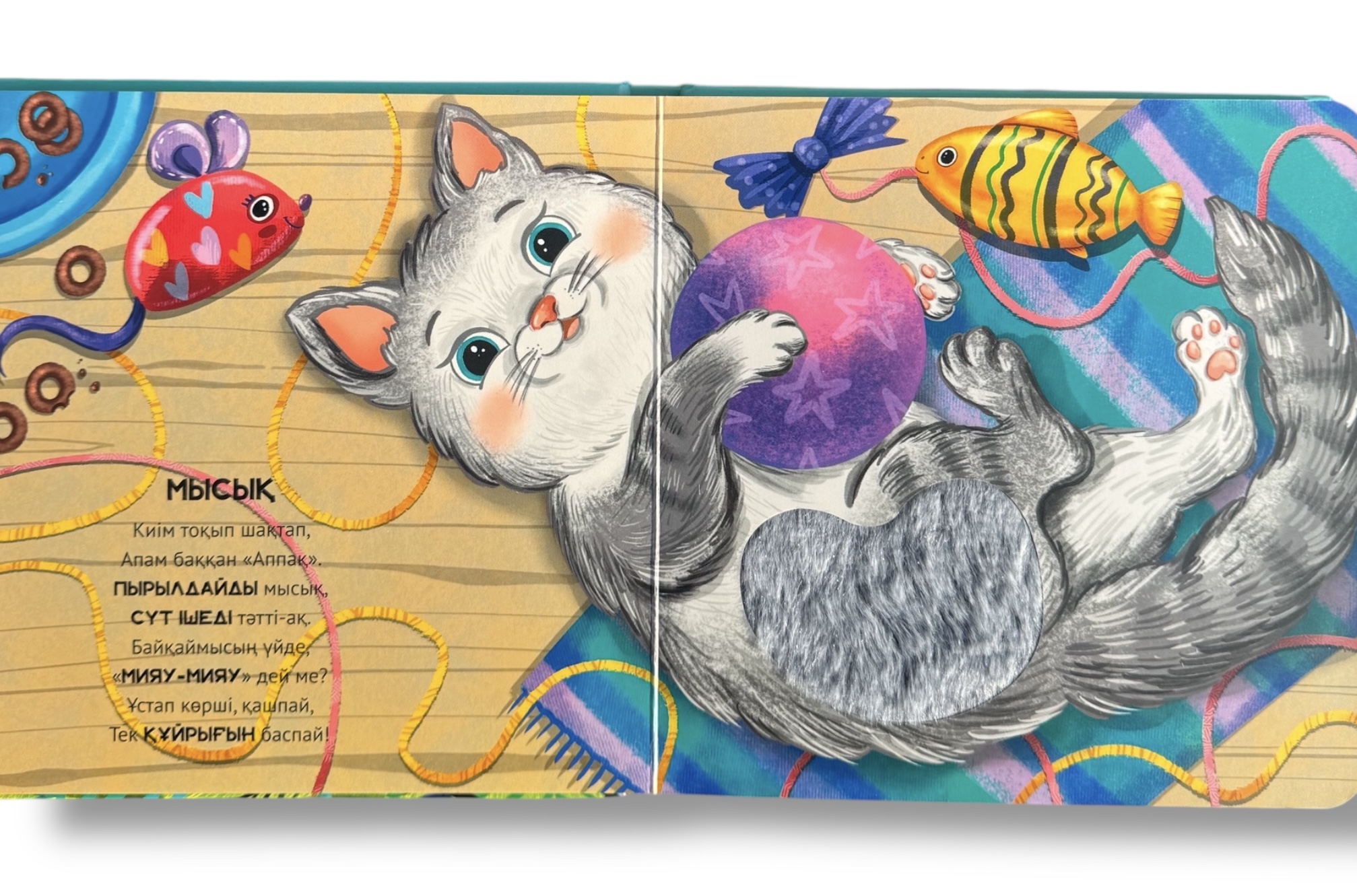 - Әр беттегі тактильді элементтер – жұмсақ, тегіс немесе кедір-бұдыр текстуралар ақпаратты сипап сезу арқылы қабылдау қабілетін дамытуға көмектеседі.