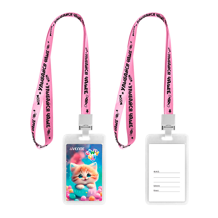 Бейдж школьный пластиковый "deVENTE. Candy Cat" 11,2x7 cм, вертикальный, прозрачный, ПВХ, на цветной ленте с принтом, с пластиковой клипсой