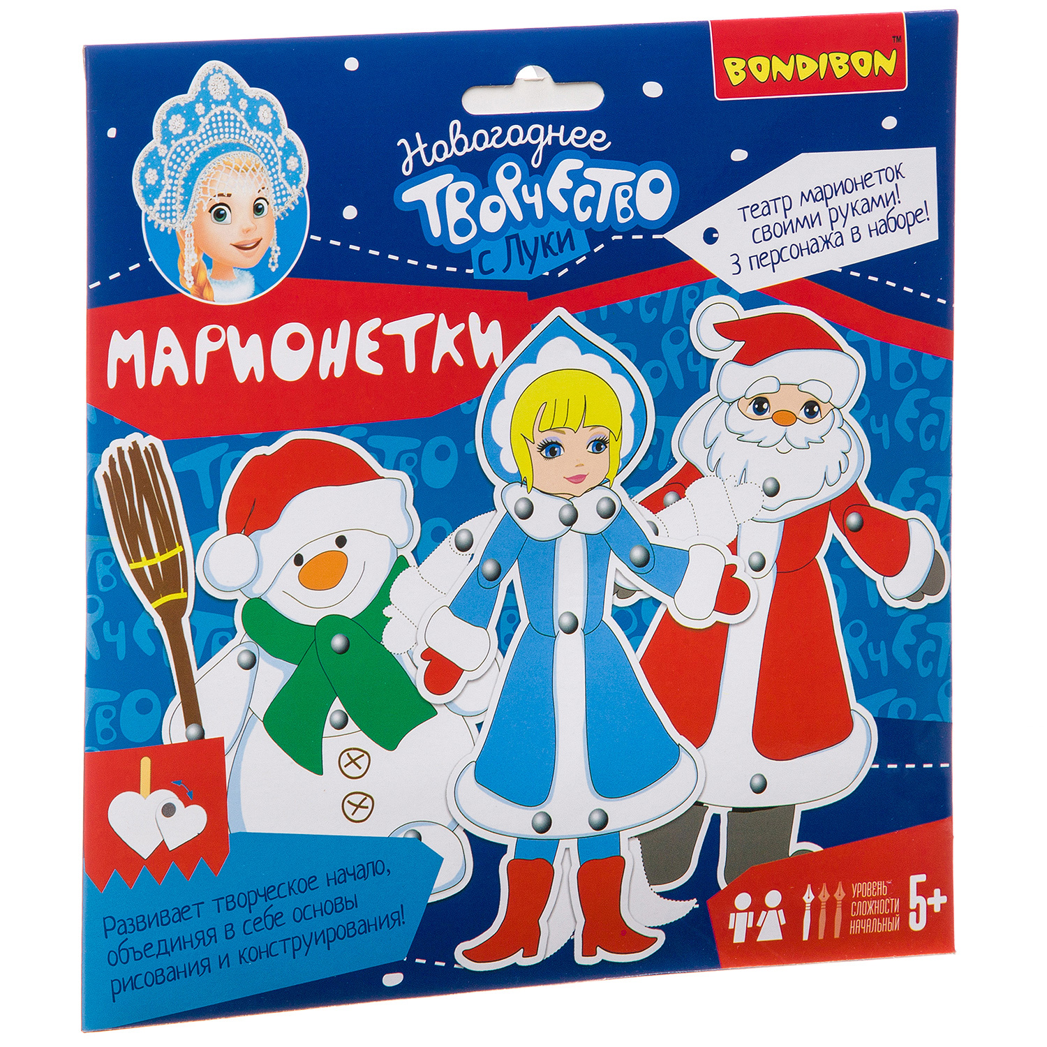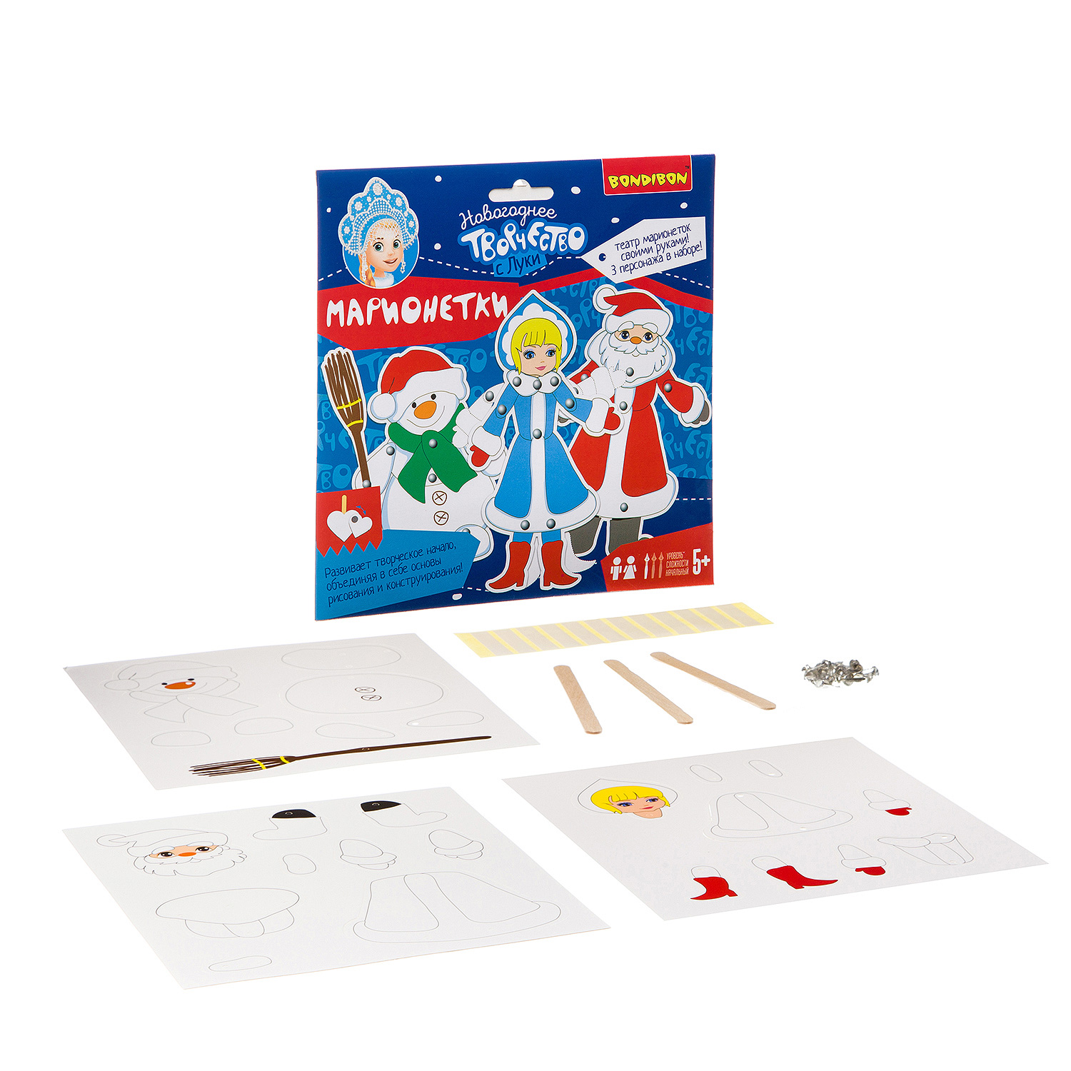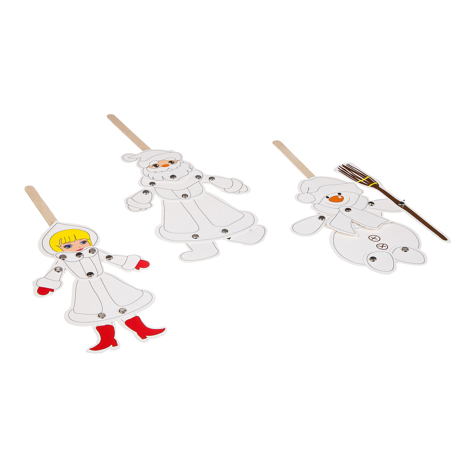 Новогодний оригинальный набор для детского творчества и увлекательная игра одновременно Из разнообразных ярких деталей ваш ребенок с огромным удовольствием составит Дед Мороза, Снегурочку и Снеговика, скрепляя их между собой металлическими безопасными пинами - кнопками. Большинство частей - подвижные, что делает игру еще более динамичной и занимательной.