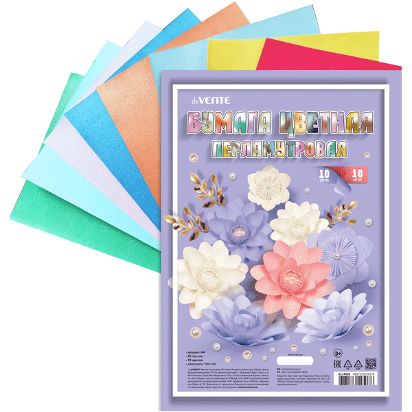 Бумага цветная перламутровая A4 "deVENTE" 120 г/м², 10 цв, 10 л, пластиковый пакет с европодвесом