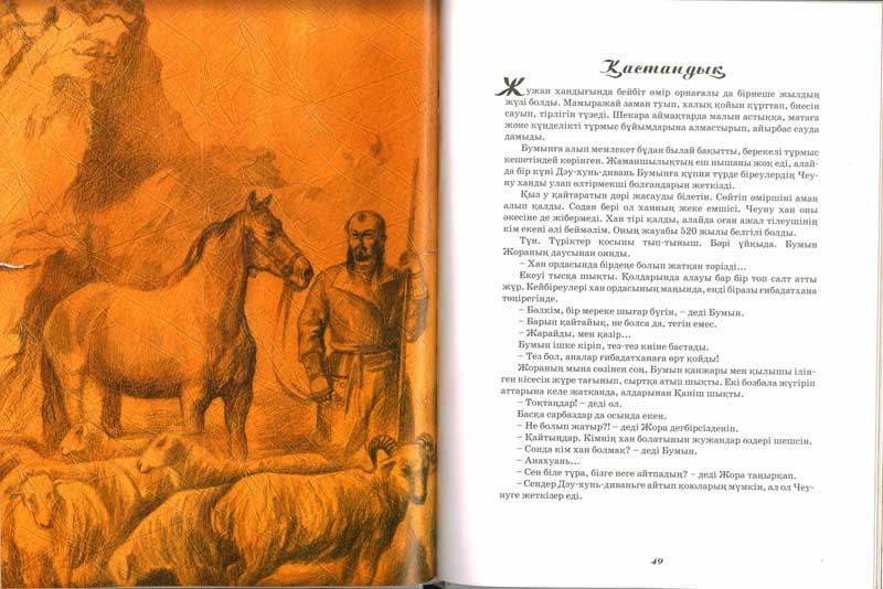 Бумын әскерді алға жіберіп, бір қапталға тоқтады. Қасындағы адамдардың жүздеріне анықтап қарады. Әуелі жанынан туған бауыры Естемі өтті, одан кейін сенімді серіктері - Қаніш пен Жора келеді. Олардың артын ала екі ұлы - Қара-Ыстық пен Мұқан... Кенет "осылардың бәрін, бәлкім, соңғы рет көріп тұрған шығармын" деген суық ой сумаң етті. Красочно иллюстрированная книга для детей и взрослых, в ней автор очень увлекательно и доступно показывает зарождение одной из самых могущественных кочевых держав раннего средневековья – Тюрского каганата и на этом историческом фоне высвечивает главного героя – кагана Бумына, первого правителя Тюрского каганата.