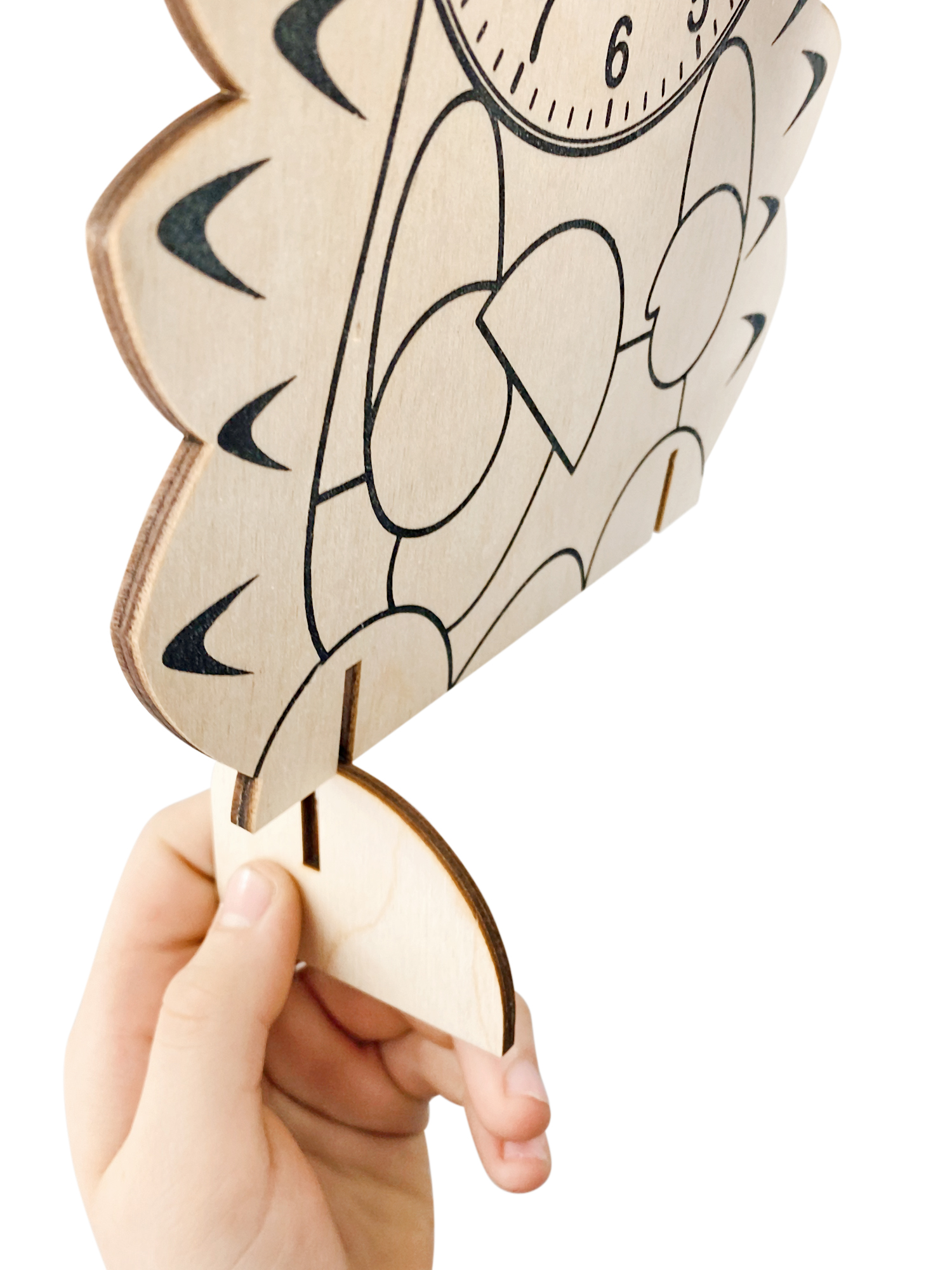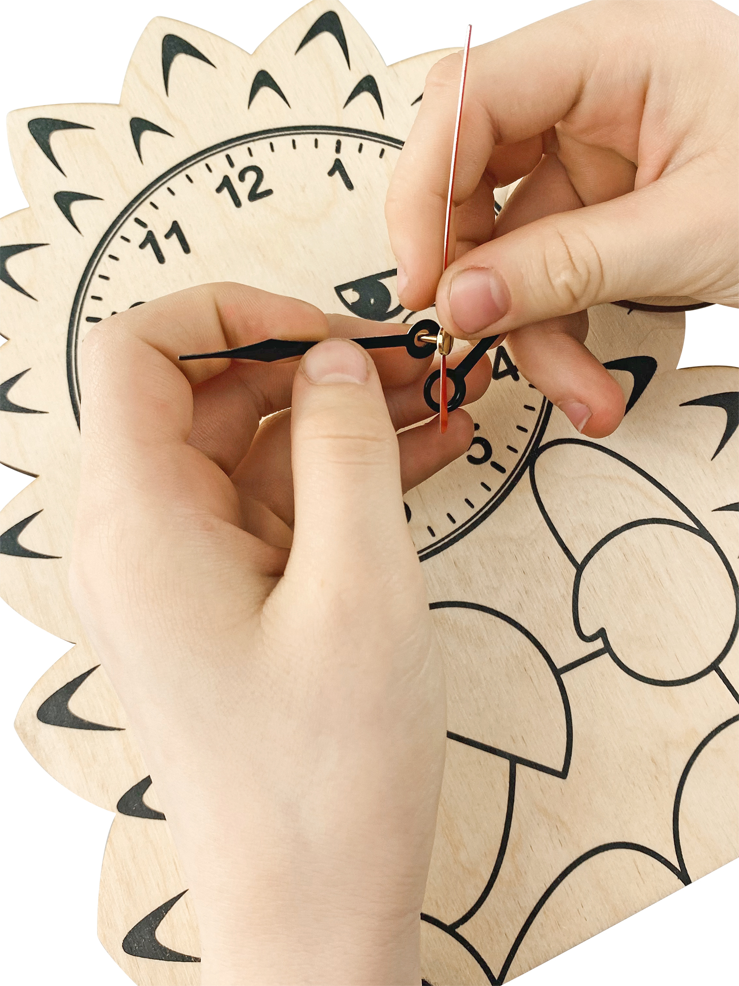 Прежде, чем приступить к сборке часов, ребенку придется разукрасить «Зайчонка» водорастворимым красителем. В зависимости от количества слоев тонера (от 1 до 4-х) меняется оттенок древесины, рисунок приобретает необходимый тон, контрастность и выразительность. Схема слоев тонировки можно увидеть на упаковке. Последующие слои тонировки наносить после полного высыхания предыдущего.