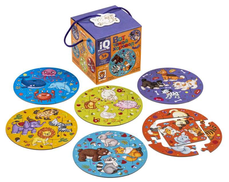 В этой коробочке собралось много интересных животных. Одни прибежали из леса, другие выплыли из моря, кто-то добрался из Африки, а кто-то живёт в доме. Тридцать крупных деталей складываются в шесть пазлов. Каждый пазл имеет свой цвет. Нужно совместить половинки животных, чтобы получилось целое изображение. Если правильно сложить пазл, а потом повернуть внутренний квадрат, получатся смешные животные. Увлекательная настольная игра разовьёт логику, моторику и пространственное мышление. Внутри коробки есть подробное описание правил игры.