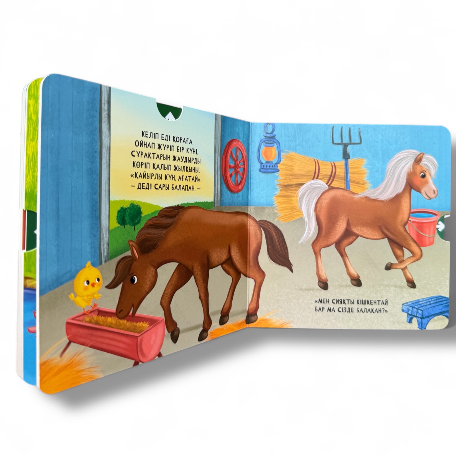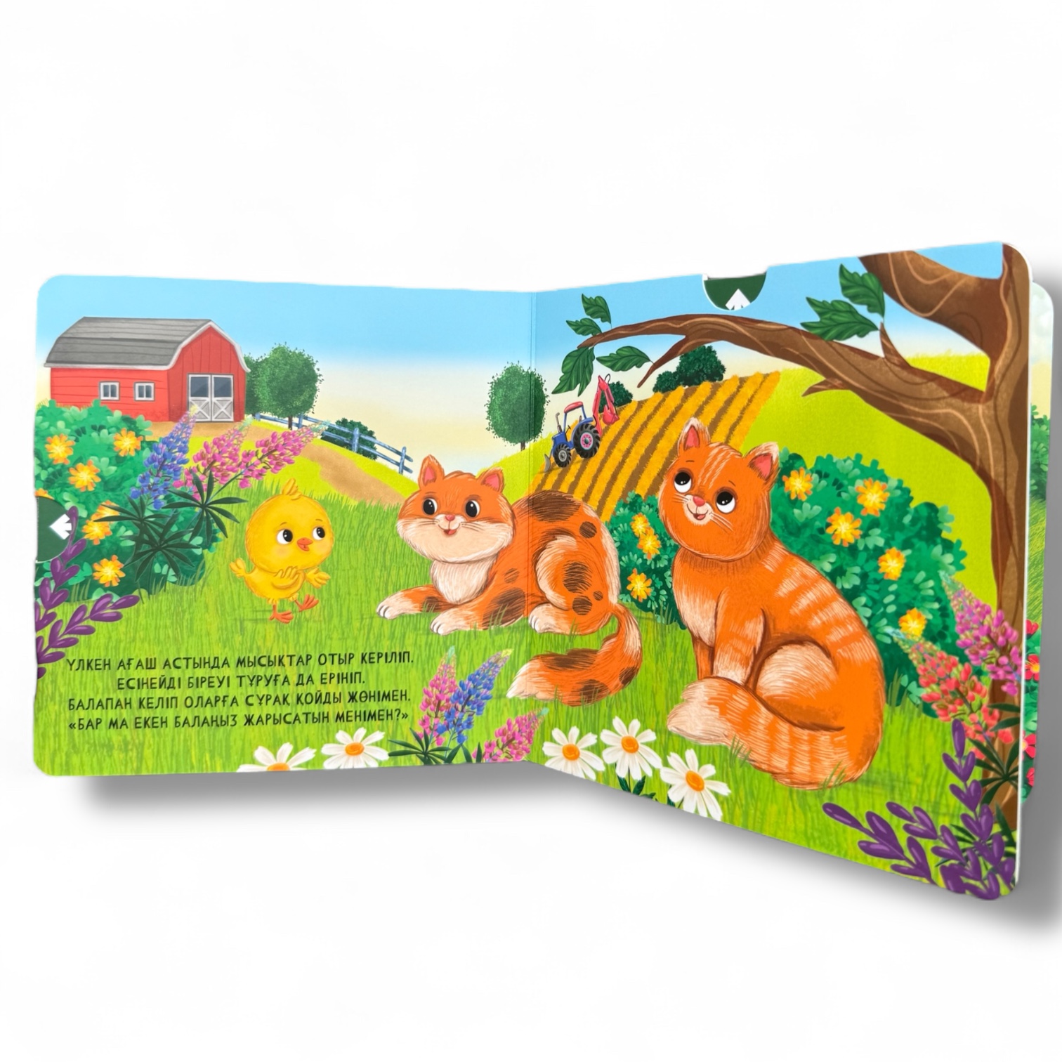 Кішкентай балапан жаңа достар іздеп шықты! Ол аймақты аралап, түрлі балақайлармен, яғни басқа жануарлардың төлдерімен танысып, барлығымен дос болғысы келеді. Бұл интерактив кітапшаны алған оқырмандарымыз жұмбақ-тақпақтарды оқып, қозғалмалы бөліктерді тартып, ашып, түртіп, жылжытып ойнай алады!