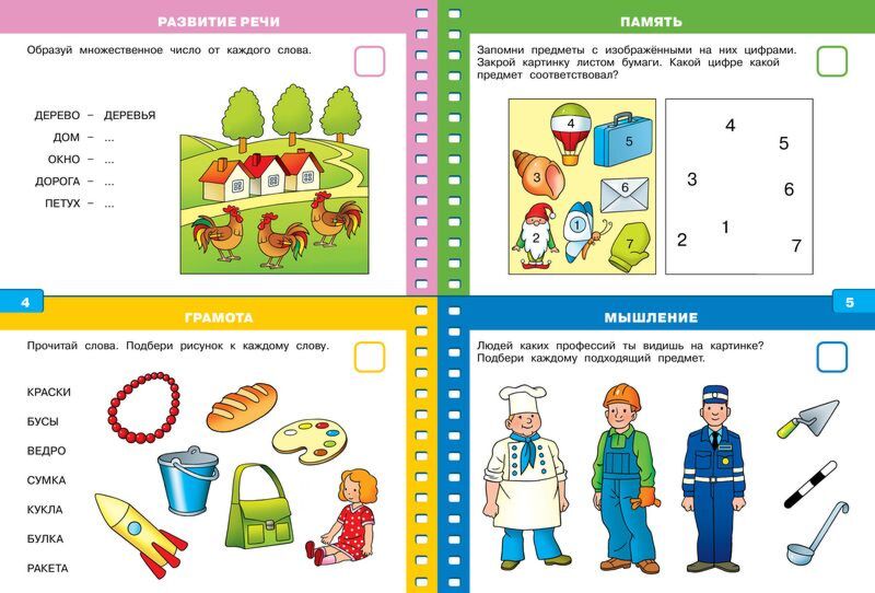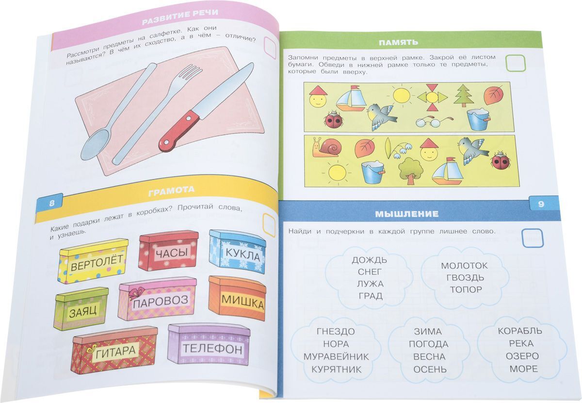 Задания в книгах «Тесты» составлены по разделам: мышление, грамота, развитие речи, математика, окружающий мир, моторика, сенсорика, внимание, память. Ребёнок ответит на вопросы по различным темам, научится размышлять и решать логические задачки, познакомится с основами чтения и счёта и подготовит руку к письму. В конце книги вы сможете подвести итог, подсчитав количество правильно и неправильно выполненных заданий.