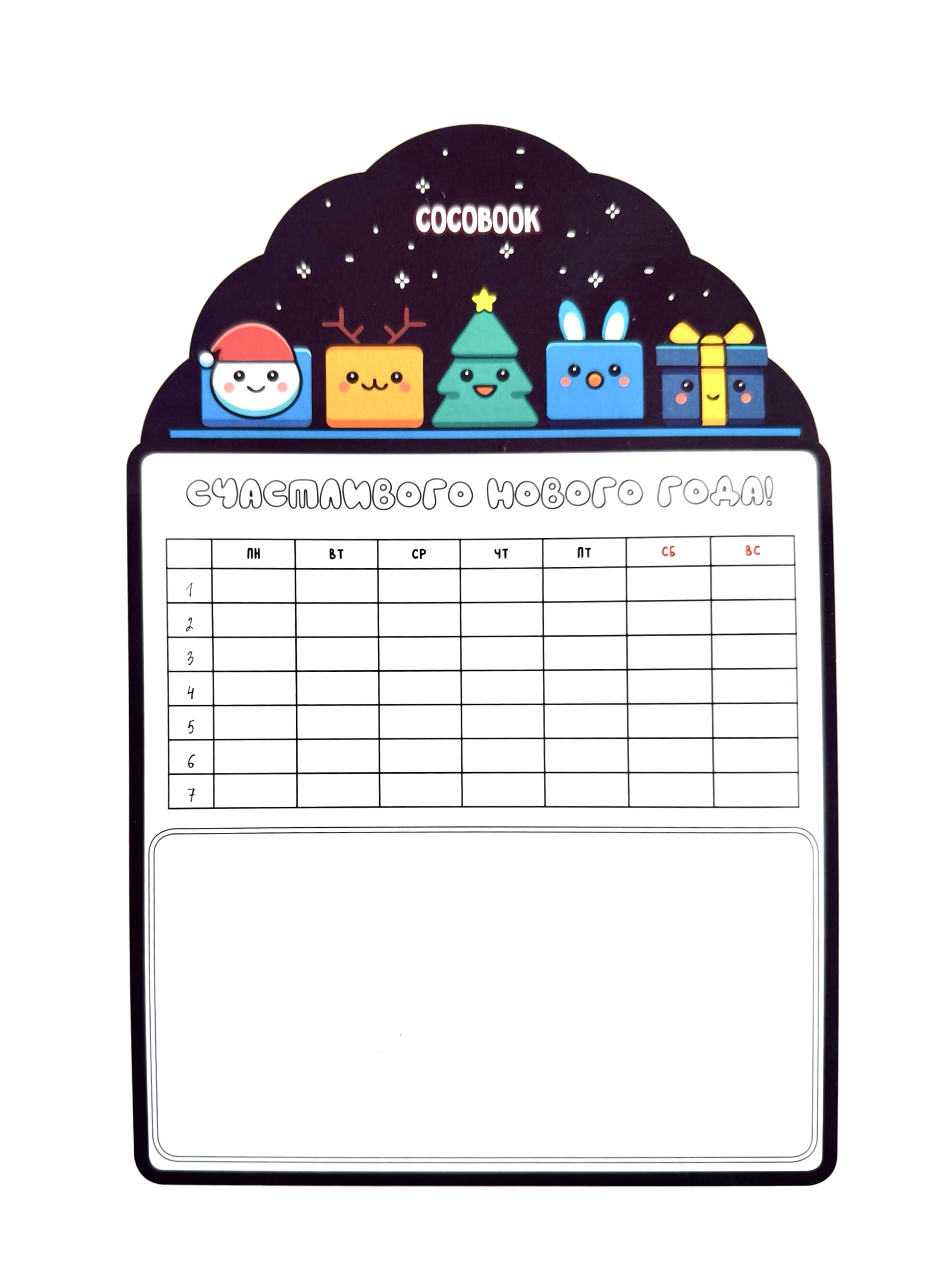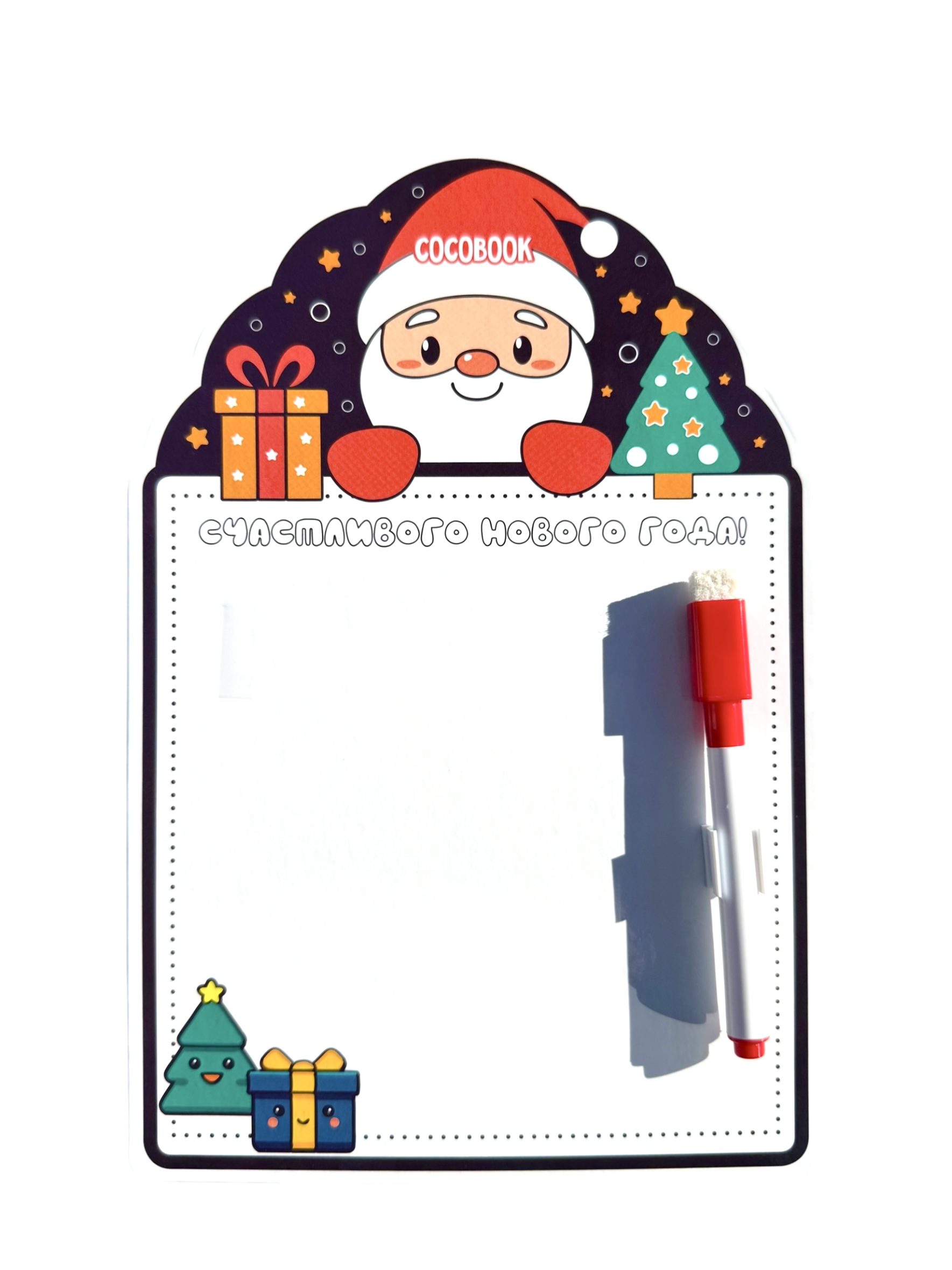 На этой доске ребёнок или взрослый может писать поздравления, рисовать весёлые картинки, составлять списки желаний или оставлять праздничные послания для друзей и близких. Маркер легко стирается, позволяя создавать новые шедевры снова и снова. Идеальный подарок для творчества, игр и праздничного настроения — дарите радость и вдохновение на Новый год!