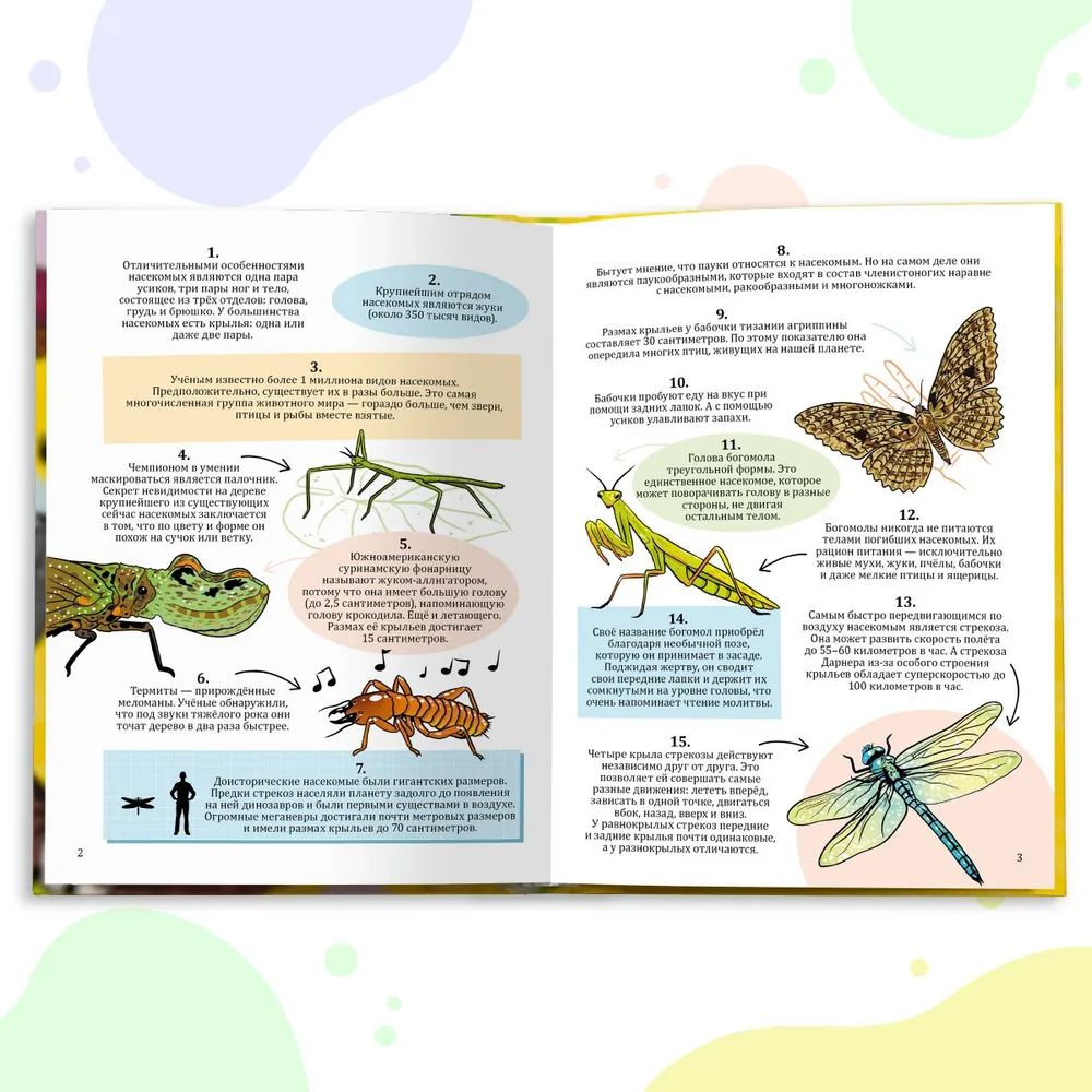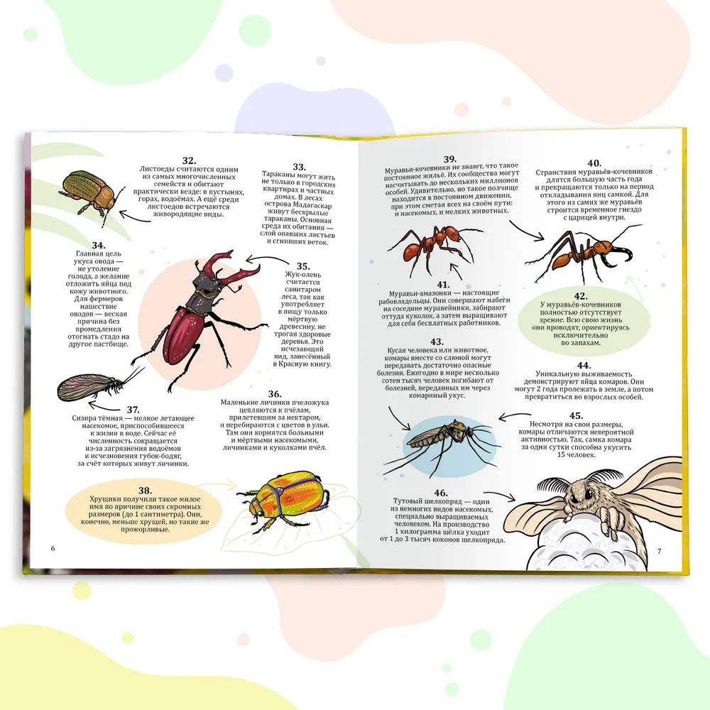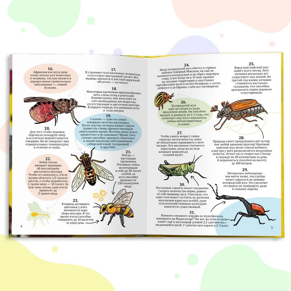 Энциклопедия на каждый день "365 фактов о насекомых и пауках" - увлекательное и информативное издание, разработанное специально для детей от 5 до 7 лет. Книга погрузит ребёнка в захватывающий мир удивительных существ, которые населяют нашу планету. Детская энциклопедия о самых интересных насекомых и пауках расскажет об их поведении, привычках и различных видовых особенностях. Как выглядит жук "Элвис Пресли"? Какими были доисторические стрекозы? Почему долгоносику установили памятник? Энциклопедия для детей ответит на эти вопросы. Яркие иллюстрации изображают главных героев небольших статей, поэтому можно узнать полезную информацию и полюбоваться на маленьких существ. Рисунки хорошо передают особенности каждого вида насекомого и паука, однако они не будут пугать малышей. Читая по одному факту в день, вам и вашему ребёнку жучки и паучки откроются с новых сторон. Большой формат книги А4 и чёткий шрифт подарят комфортное чтение. Твёрдую и яркую обложку удобно держать даже в маленьких ручках. Помимо этой книги в серии энциклопедий "365 фактов" вы найдёте различные темы: транспорт, динозавры, космос, животные и обо всём на свете. Отличный вариант для первого знакомства детей с разными сферами жизни, для развития ума и любопытства. Энциклопедия для мальчиков откроется как интересная книга, потому что факты информативны. Энциклопедия для девочек будет интересна красивым оформлением. Красочные иллюстрации и интересные факты делают эти энциклопедии незаменимыми помощниками в развитии малышей и первых шагах в обучении. Многие факты удивят не только детей, но и взрослых! Серия энциклопедий обязательно понравится и мальчикам, и девочкам.
