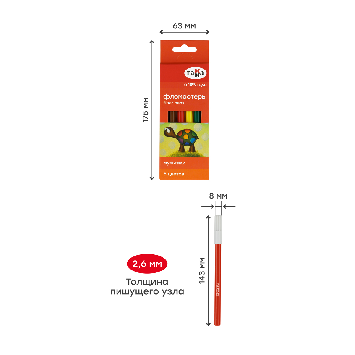 Фломастеры ГАММА серии «Мультики» созданы для комфортного детского творчества. В наборе 6 насыщенных цветов: чёрный, зелёный, красный, синий, жёлтый, коричневый. Тип наконечника – конический. Толщина пишущего узла – 2,6 мм позволяет наносить как тонкие, так и толстые линии для создания ярких рисунков. Чернила на основе воды и пищевых красителей легко смываются с одежды и рук. Вентилируемый колпачок обеспечивает безопасность ребенка в творческом процессе – при случайном проглатывании он не препятствует дыханию. При этом наконечник фломастера изолирован и чернила не высыхают. Корпус круглой формы диаметром 8 мм изготовлен из безопасного полипропилена и имеет удобную круглую зону захвата. Набор фломастеров упакован в красочную картонную упаковку с европодвесом, которая может вдохновить ребёнка на творчество. Продукция морозоустойчива.