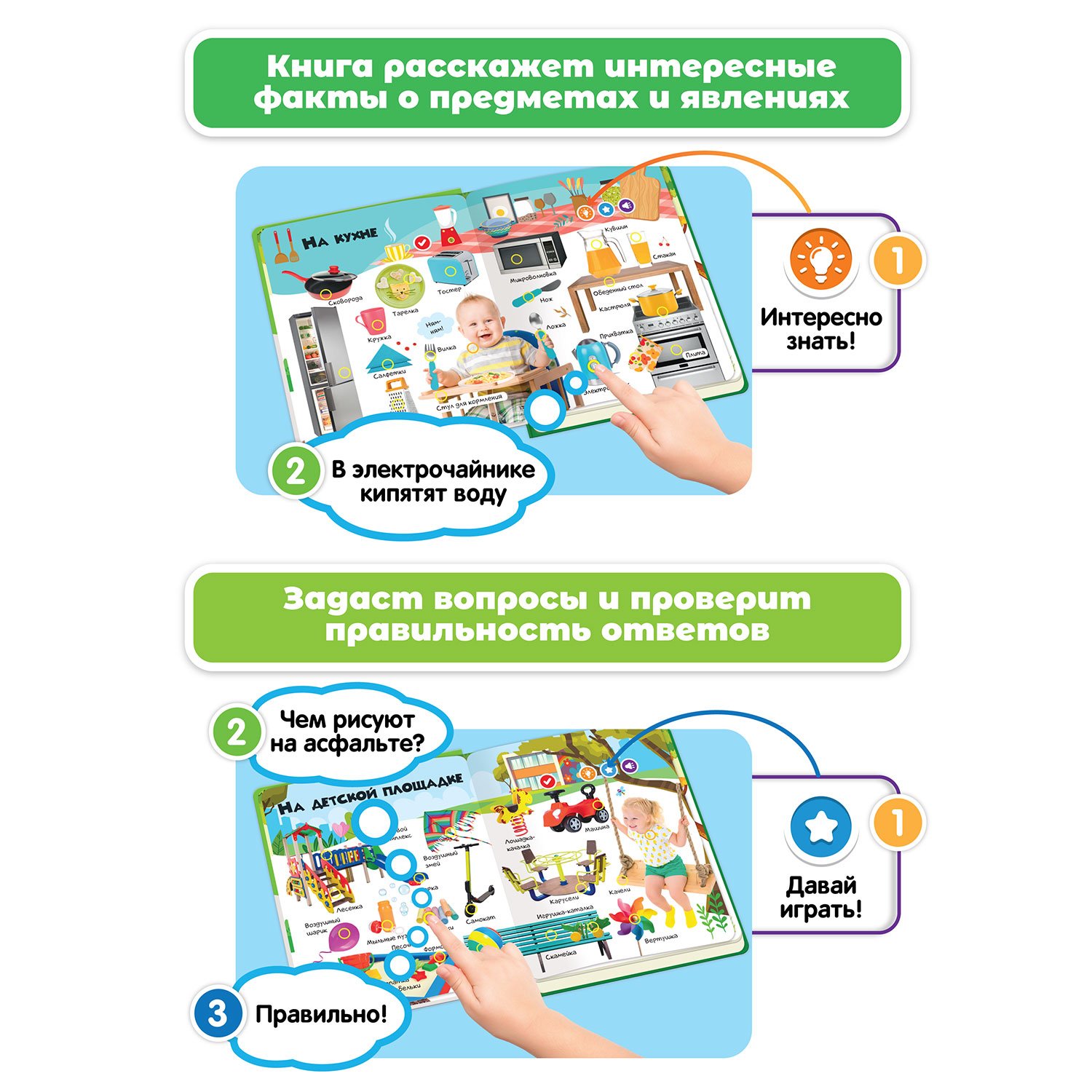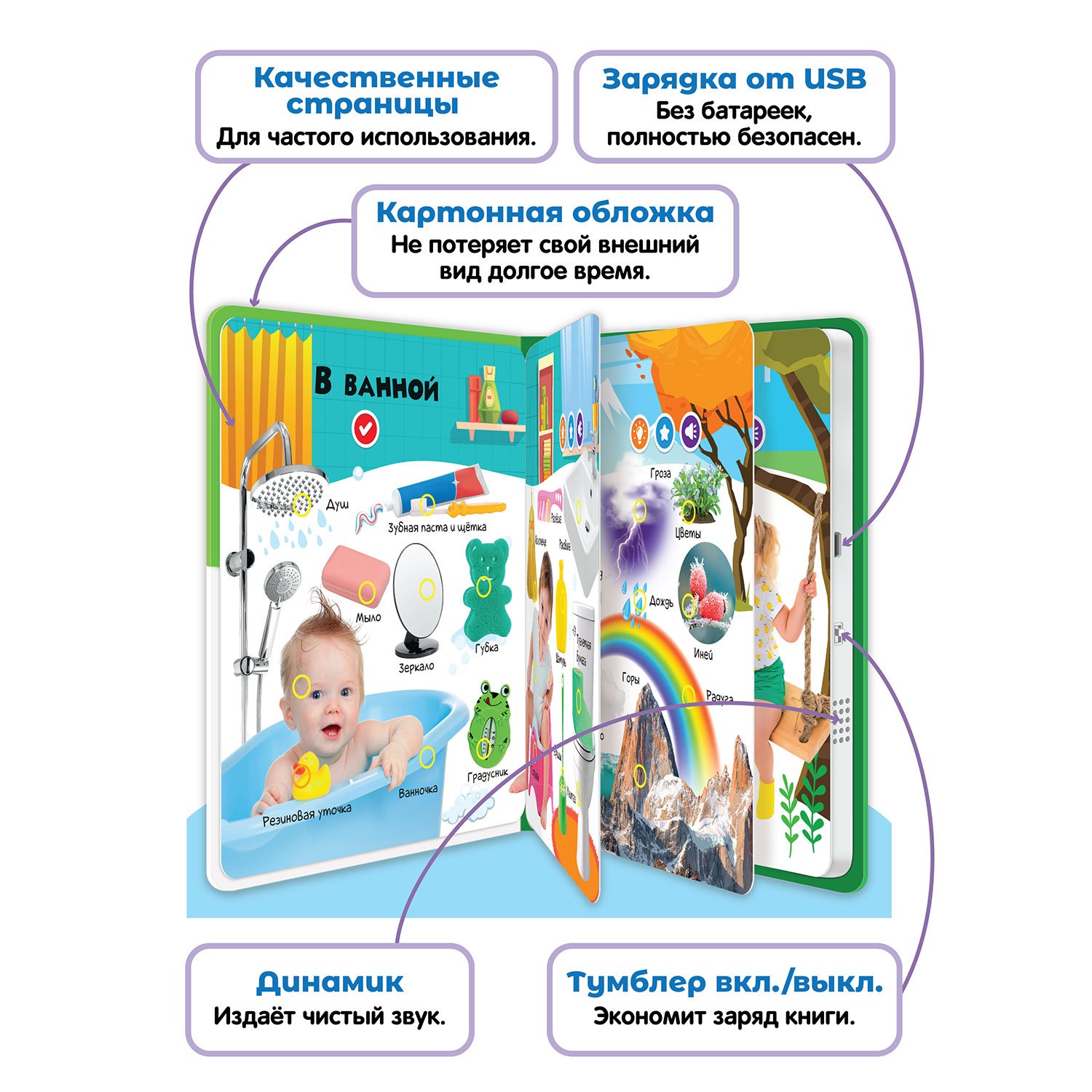 -Все страницы интерактивные: нажимайте на страницы, слушайте звуки, выполняйте задания, узнавайте интересные факты.