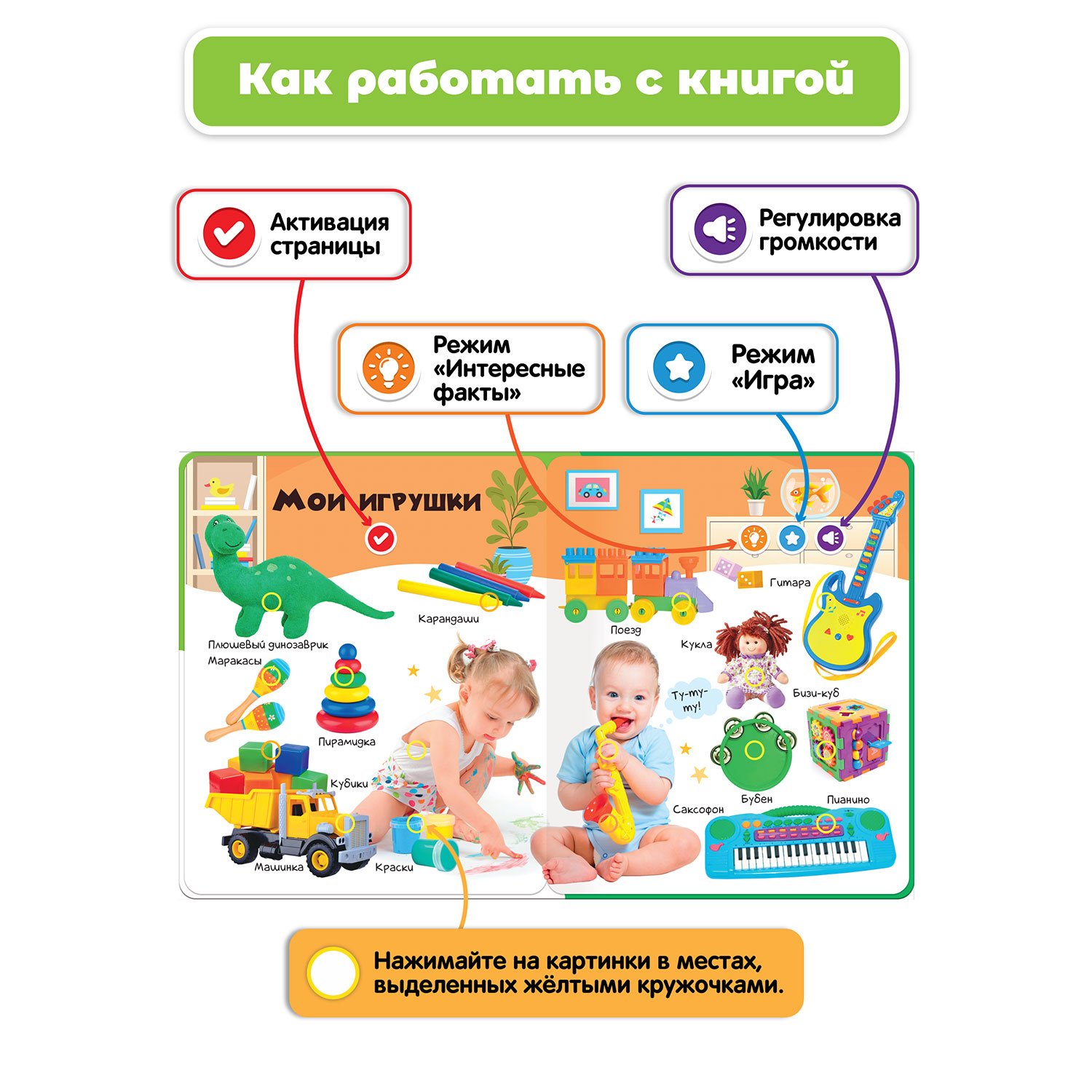 -Музыкальная книжка Нажималка - это более 500 звуков, фраз и заданий! С книгой процесс обучения увлекательным и разнообразным. 3 режима занятий на каждом развороте.