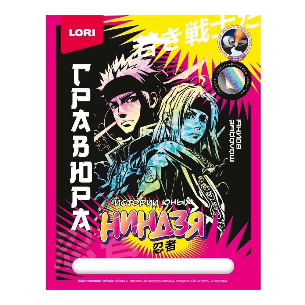 Скретчинг — это особый вид рисования методом сцарапывания верхнего слоя краски специальным инструментом — штихелем. В процессе работы, штрих за штрихом, проглядывается яркая цветная картинка с крутыми героями ниндзя, которые на черном фоне смотрятся необычно и стильно.