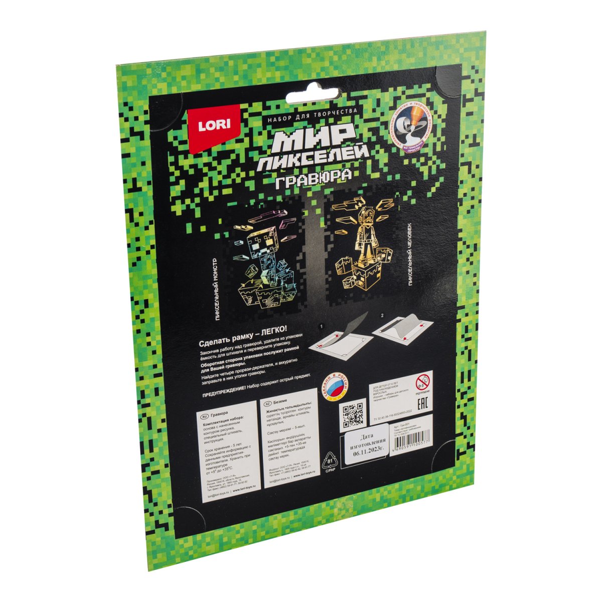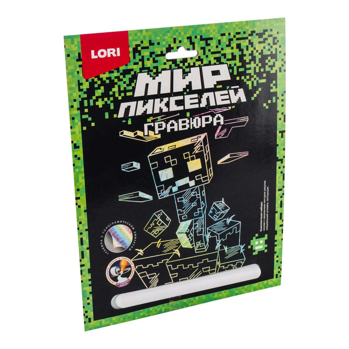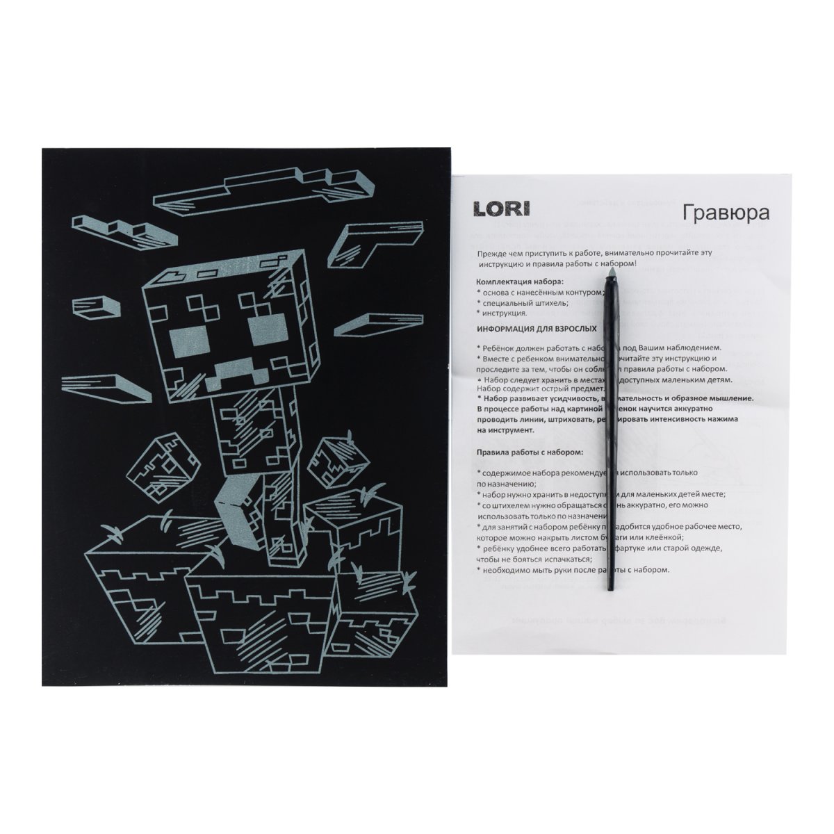Гравюра представляет собой многослойное панно, покрытое чёрной краской, на которое нанесён контур рисунка. Техника создания гравюры увлекательна и достаточно проста. Необходимо лишь взять штихель – особый скребок, входящий в состав набора, и процарапать рисунок гравюры.