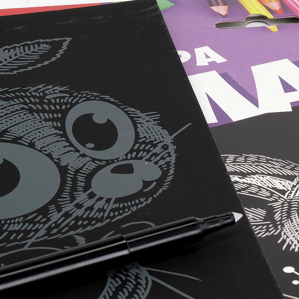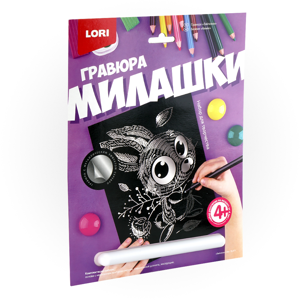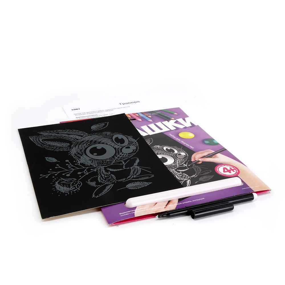 Увлекательная серия гравюр «Милашки» с забавными животными. Гравюра подойдет детям с 4 лет. Техника выполнения гравюры увлекательна и достаточно проста. Необходимо лишь взять штихель – особый скребок, входящий в состав набора, и процарапать рисунок гравюры. Она помогает ребенку тренировать усидчивость, развивать аккуратность и мелкую моторику.