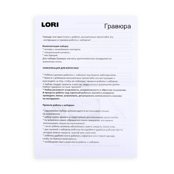 Гравюра - особый вид графического искусства. Сцарапывая верхний слой гравюры специальным штихелем, входящим в набор, ребенок может самостоятельно создать настоящее произведение искусства и почувствовать себя гравером.