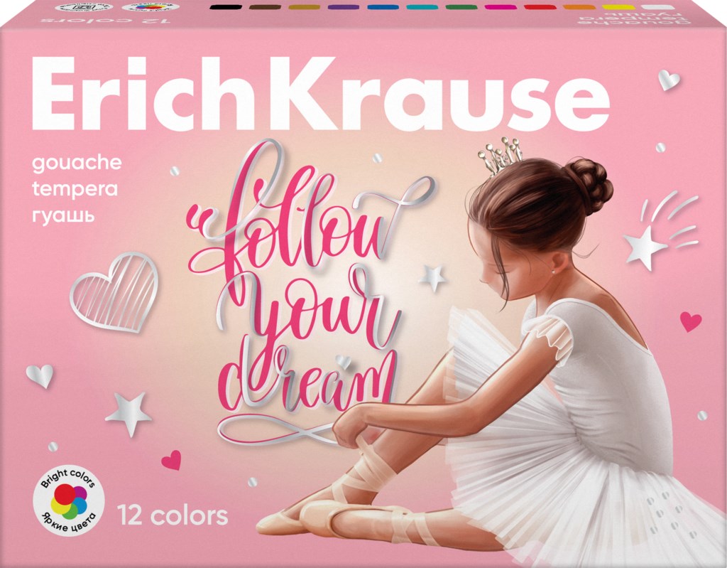 Гуашь ErichKrause отличает высокая кроющая способность краски. Цвета насыщенные, глубокие, отлично перекрываются и образуют экстра матовую бархатистую поверхность по мере высыхания краски. При этом сохраняется яркость и насыщенность тона, краски ложатся ровно, не осыпаются. Хорошо разводится и размывается водой, легко набирается на кисть.
