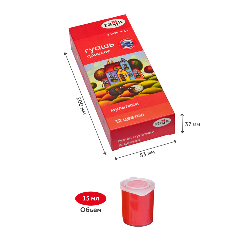 Гуашь «ГАММА» «Мультики» в новой удобной упаковке – блок-таре. В наборе 12 цветов, объем одной баночки – 15 мл. Гуашевые детские краски «Мультики» отличаются высокой плотностью и укрывистостью, легко наносятся на бумагу или картон и быстро высыхают. После высыхания рисунок приобретает матово-бархатистую поверхность. Яркие цвета прекрасно смешиваются между собой, позволяя получать новые красивые и чистые оттенки. Краски «ГАММА» изготовлены на основе натуральных компонентов и высококачественных пигментов. Краски для рисования легко смываются с рук. Гуашь «Мультики» фасуется в новую удобную упаковку – блок-тару, баночки спаяны между собой и находятся в одной «связке», что позволяет ребенку хранить краски разных цветов вместе, препятствуя их случайному опрокидыванию с рабочей поверхности, а также потере крышечек. Хорошая герметичность баночек: они удобно, легко открываются и закрываются без усилий. Набор красок упакован в яркую картонную упаковку.