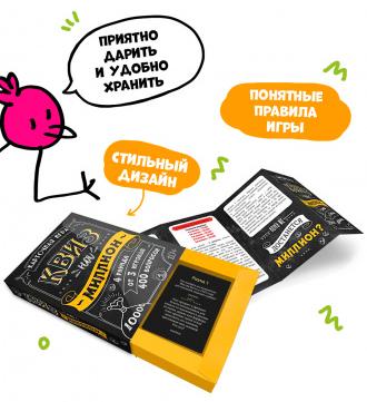 "Квиз" - интеллектуальная игра-викторина, с невероятной скоростью штурмующая полки магазинов и сердца многочисленных поклонников. Настольная игра "Квиз" от "Геодом" - это целых 400 крутых и неожиданных вопросов для детей и взрослых, стильная упаковка и неограниченное количество вариантов игры. Играйте вдвоем, играйте в кругу семьи или в дружной большой компании - процесс в любом случае окажется веселым и увлекательным! Игра не требует особенной подготовки либо фундаментальных знаний, здесь важна скорость реакции, сообразительность и смекалка, ведь ответ на вопрос очень часто лежит на поверхности. Комплектация: коробка из плотного картона, 100 глянцевых карточек форматом 6,5 х9,5 см с вопросом и ответом.