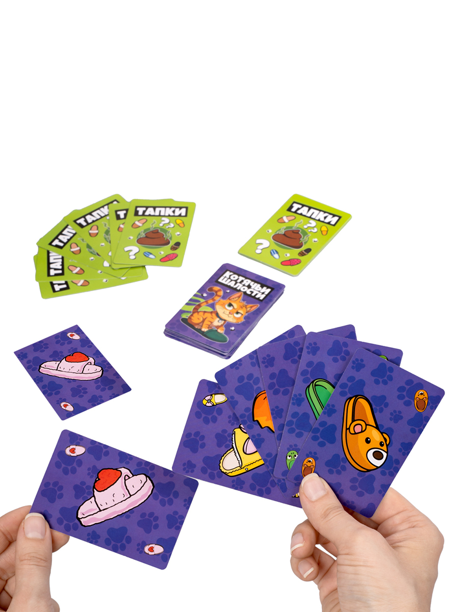 По очереди тяните карты у других игроков, пытаясь собрать как можно больше пар, чтобы сбросить их и быстрее остаться без карт. Если не получилось – придётся рискнуть и взять карту из колоды действий, где вас ждут неожиданные повороты: коварный котик может подставить, карты внезапно перемешаются, или правила перевернутся с ног на голову! Совет котика: не держите тапки слишком долго, особенно если один из них с "сюрпризом"!