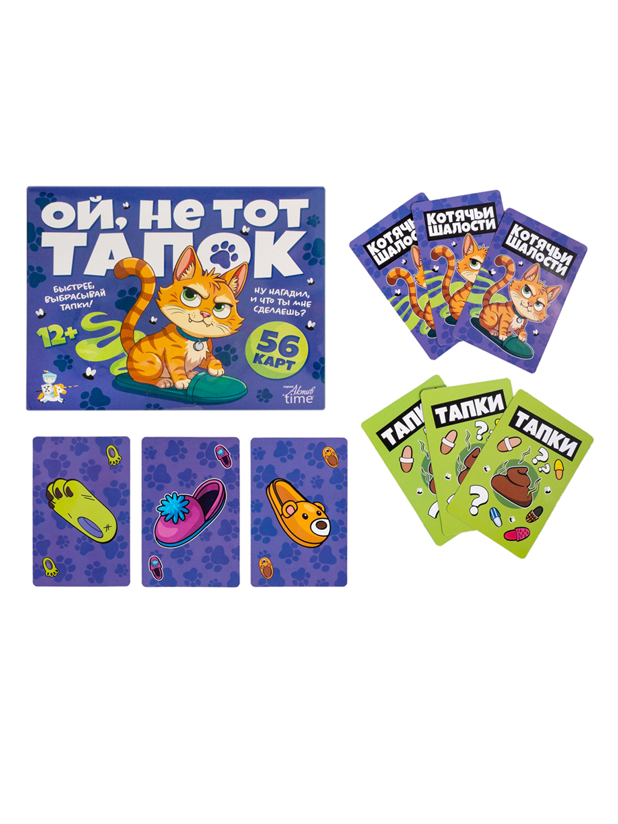 Настольная игра «Ой, не тот тапок» - это азартная и весёлая игра, в которой вам предстоит ловко избавляться от карт. Котик заскучал и устроил хаос! По всему дому разбросаны тапки, потерявшие свои пары, а один из них превратился в тот самый проблемный тапок ... Кто останется с этим подарком? Проверь свою удачу и ловкость!