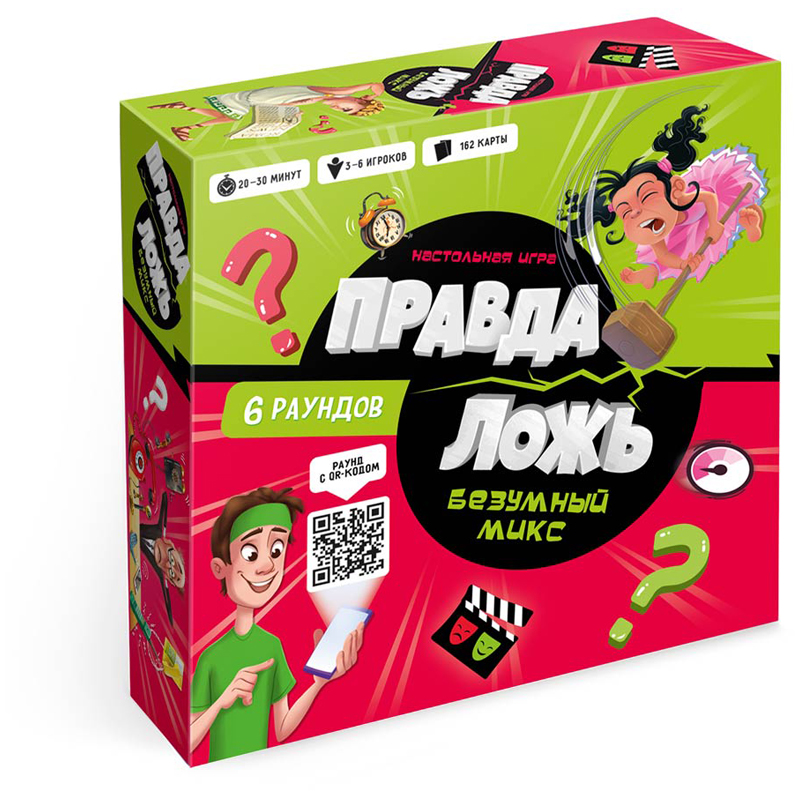 Легендарная "Правда-ложь" – теперь в формате большой игры! Приготовьтесь к сумасшедшей гонке: вас ждет 6 захватывающих раундов, новые интересные факты и много веселья. Отвечайте на каверзные вопросы, угадывайте, о чем думают другие игроки, и импровизируйте на ходу, чтобы прийти к финишу первым! В комплекте: игровое поле, 152 карточки, фишки и правила игры. Количество игроков: 3–6. Рекомендованный возраст: 6+