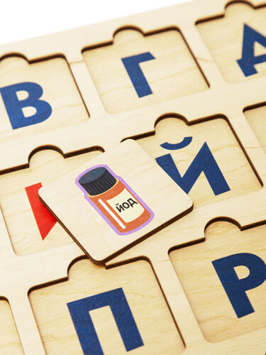 Задача малыша — расположить пазлы с изображениями предметов на место нужной буквы на планшете. Например, рыбка – на букву «Р», юла – на «Ю», звезда – на «З». Благодаря такой игре ребёнок помимо букв начнёт запоминать и слова тоже.