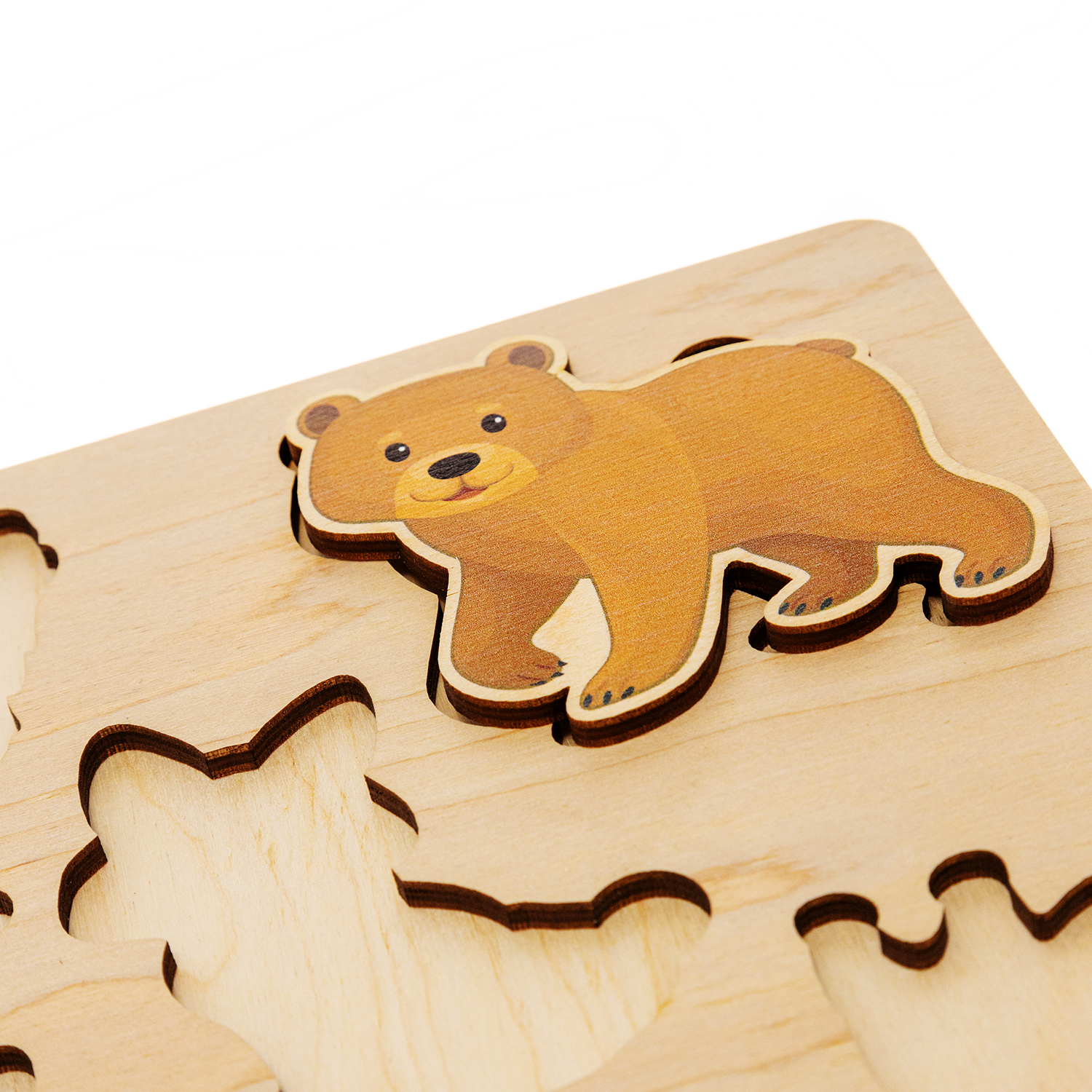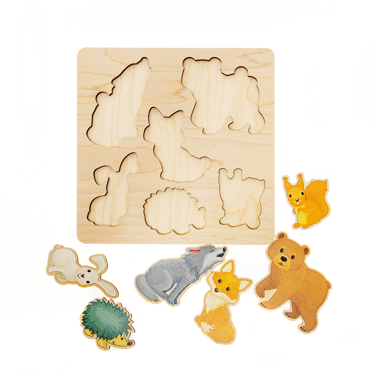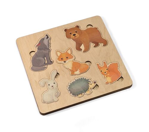 Деревянный пазл «Лесные животные» — это простая развивающая игра для малышей от 3-х лет.