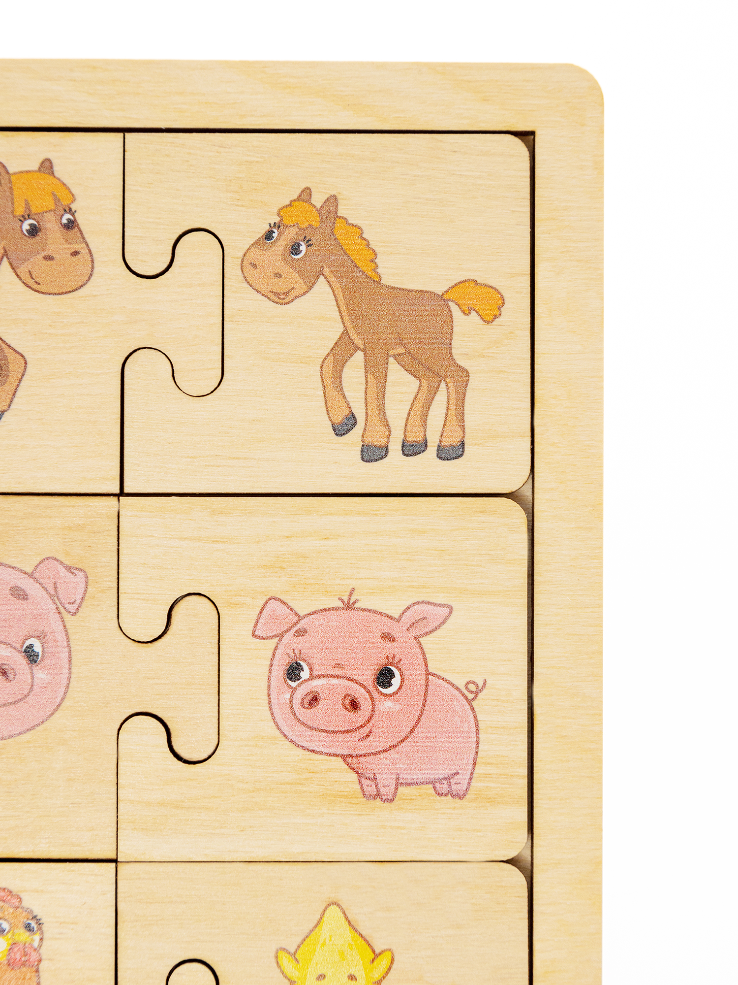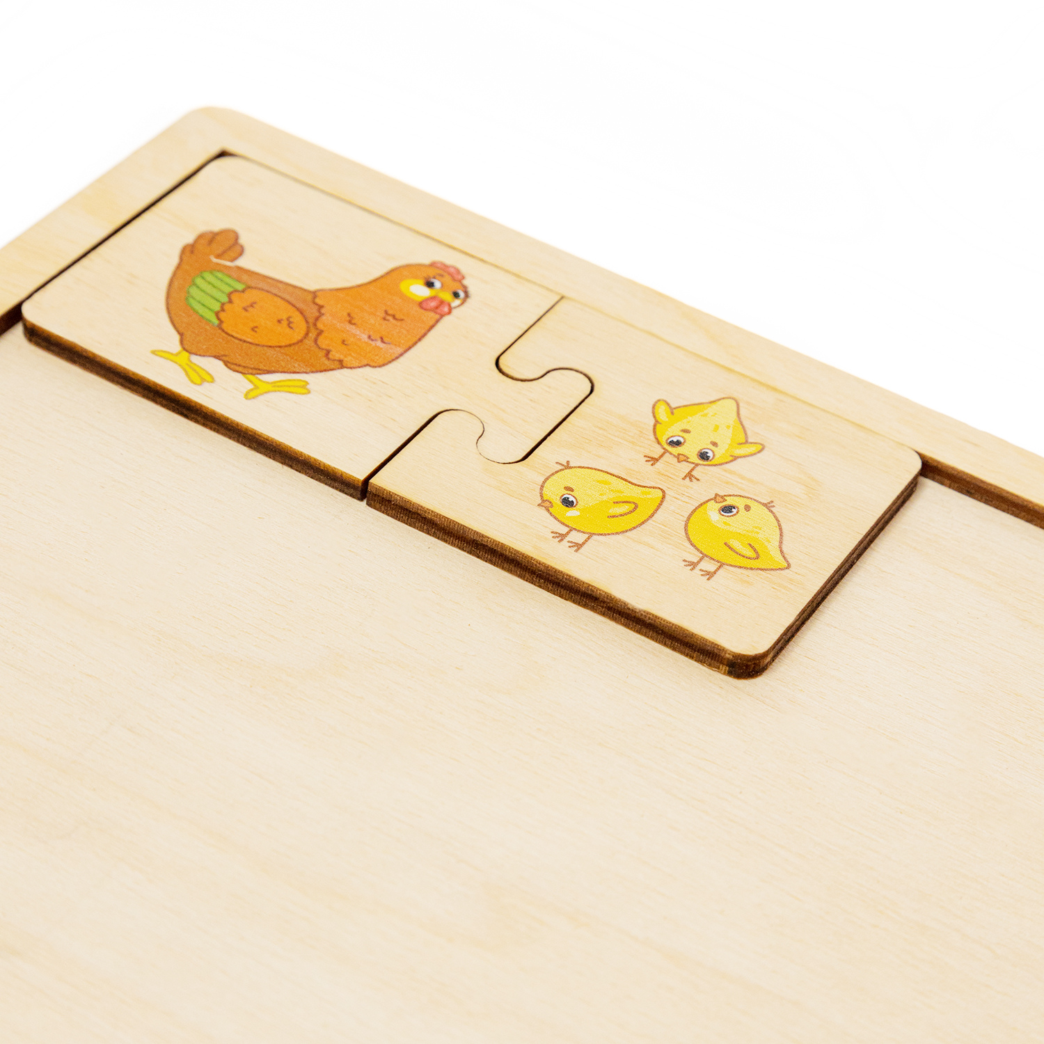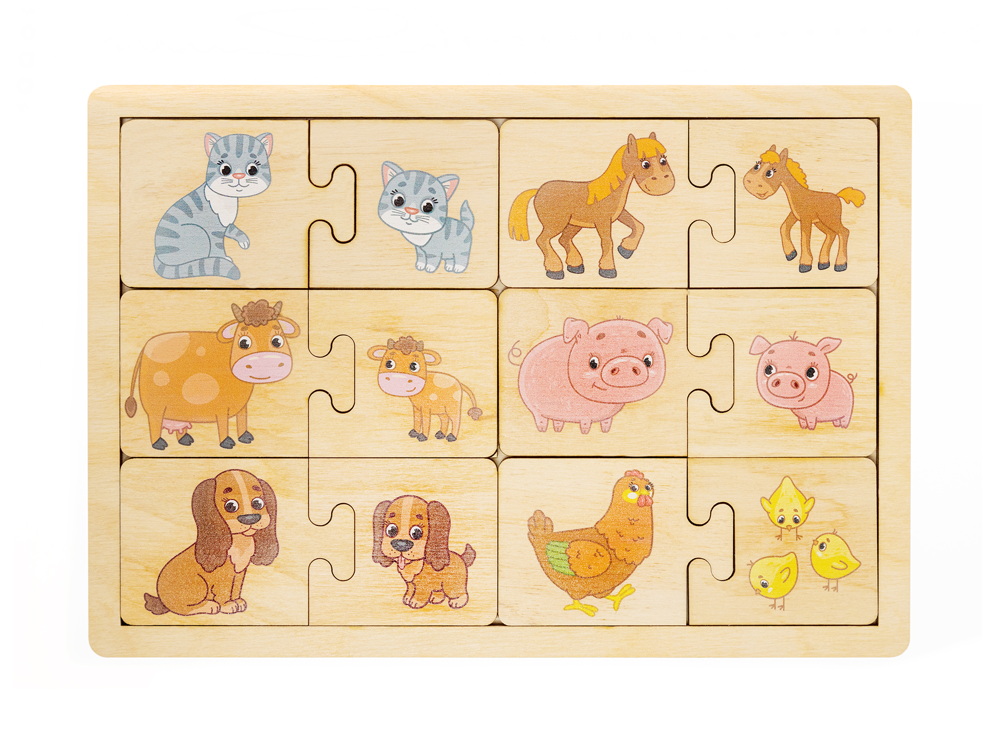 На 12 элементах пазла размерами 57х50 мм нанесены изображения взрослых животных и их детёнышей. Вот кошка, а вот её котёнок. Вот курочка, а вот её цыплёнок.