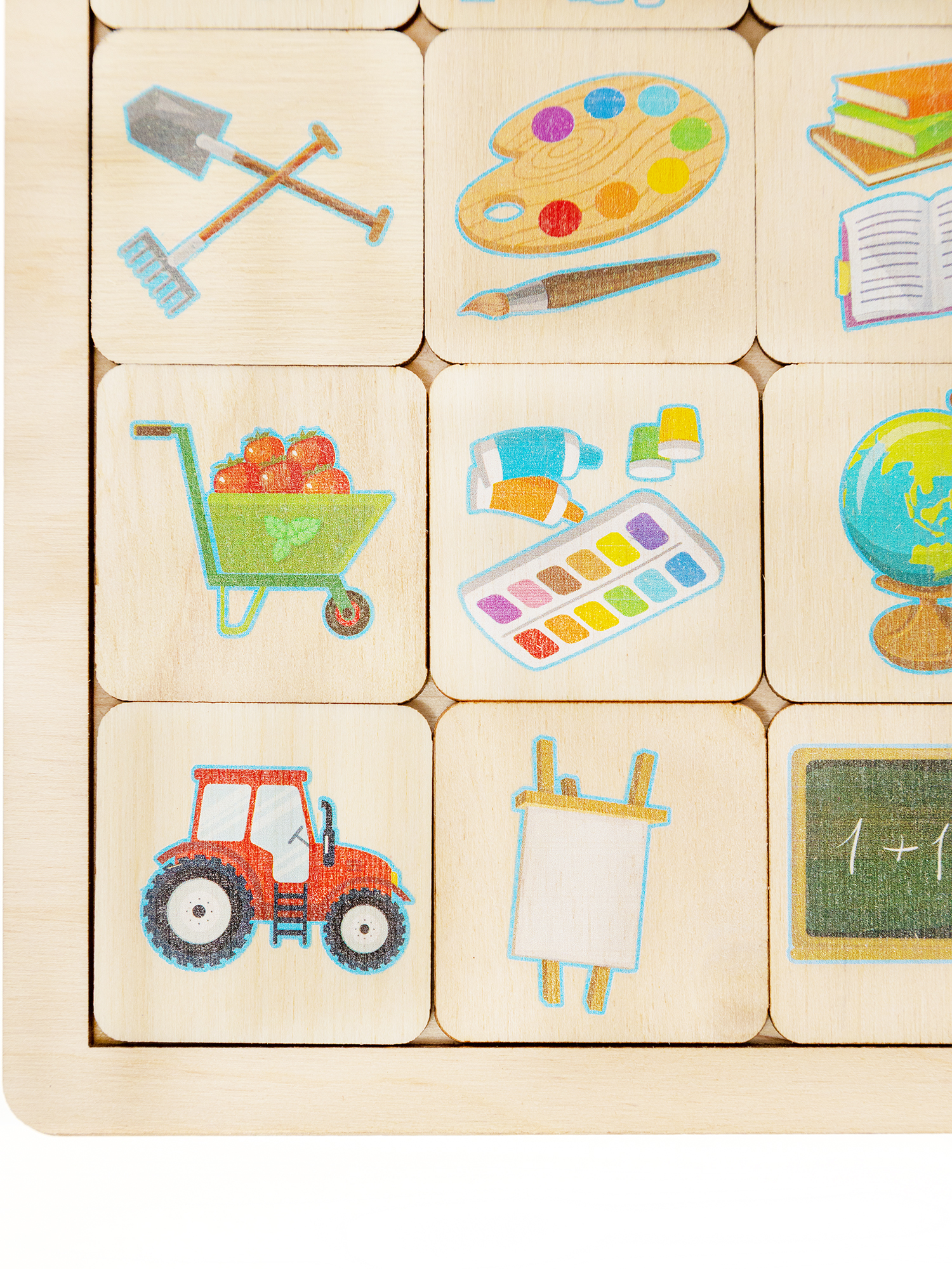 Угадать врача, повара или учителя в нашей игре можно с помощью трёх предметов-подсказок, вразнобой расположенных на деревянном планшете. Переставляя пазлы, малыш сможет составить верные комбинации из предметов для каждой из 6 профессий.