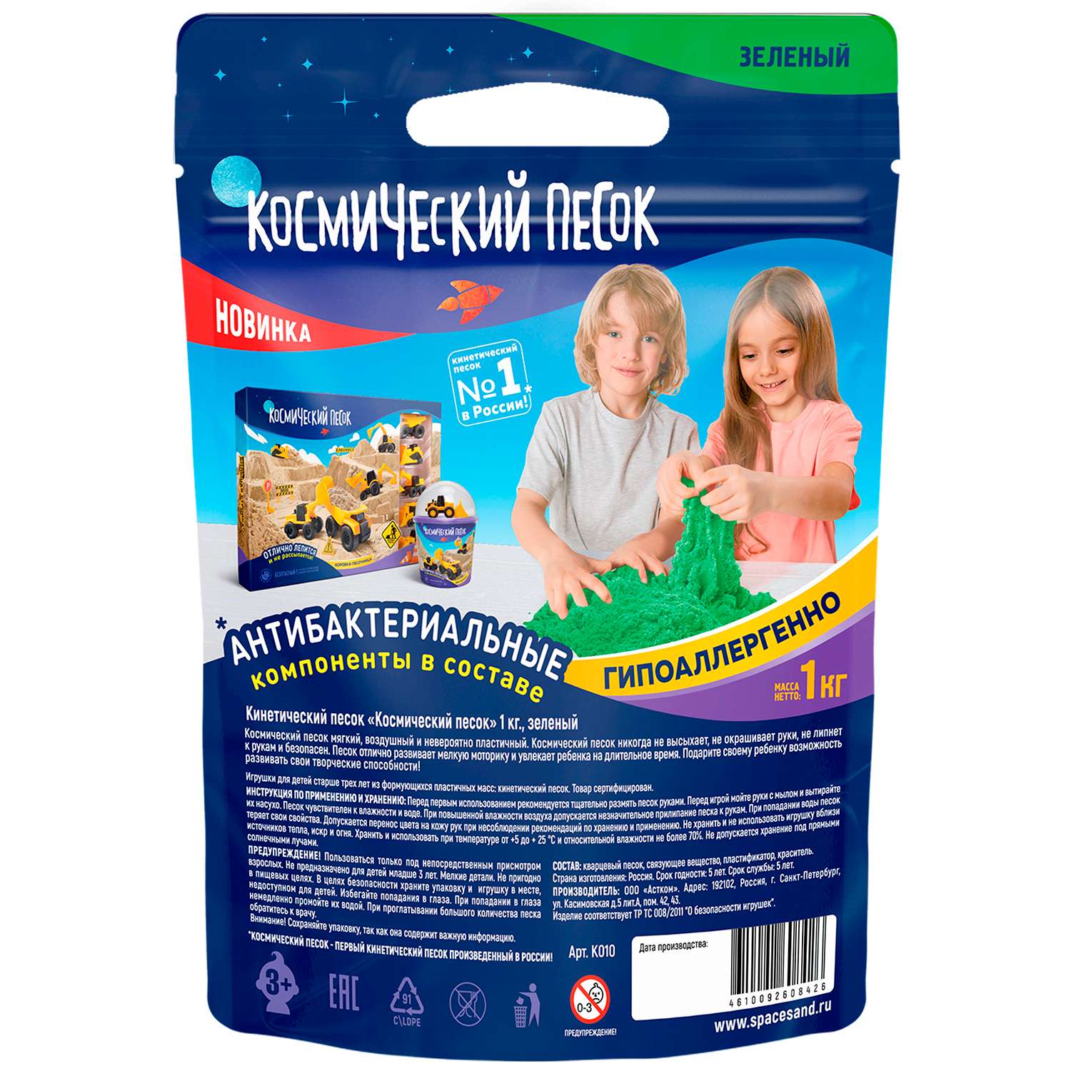 «Космический песок» – первый кинетический песок, произведенный в России! Песок не имеет запаха и не красит руки. Он полностью безопасен за счет антибактериальных компонентов в составе.