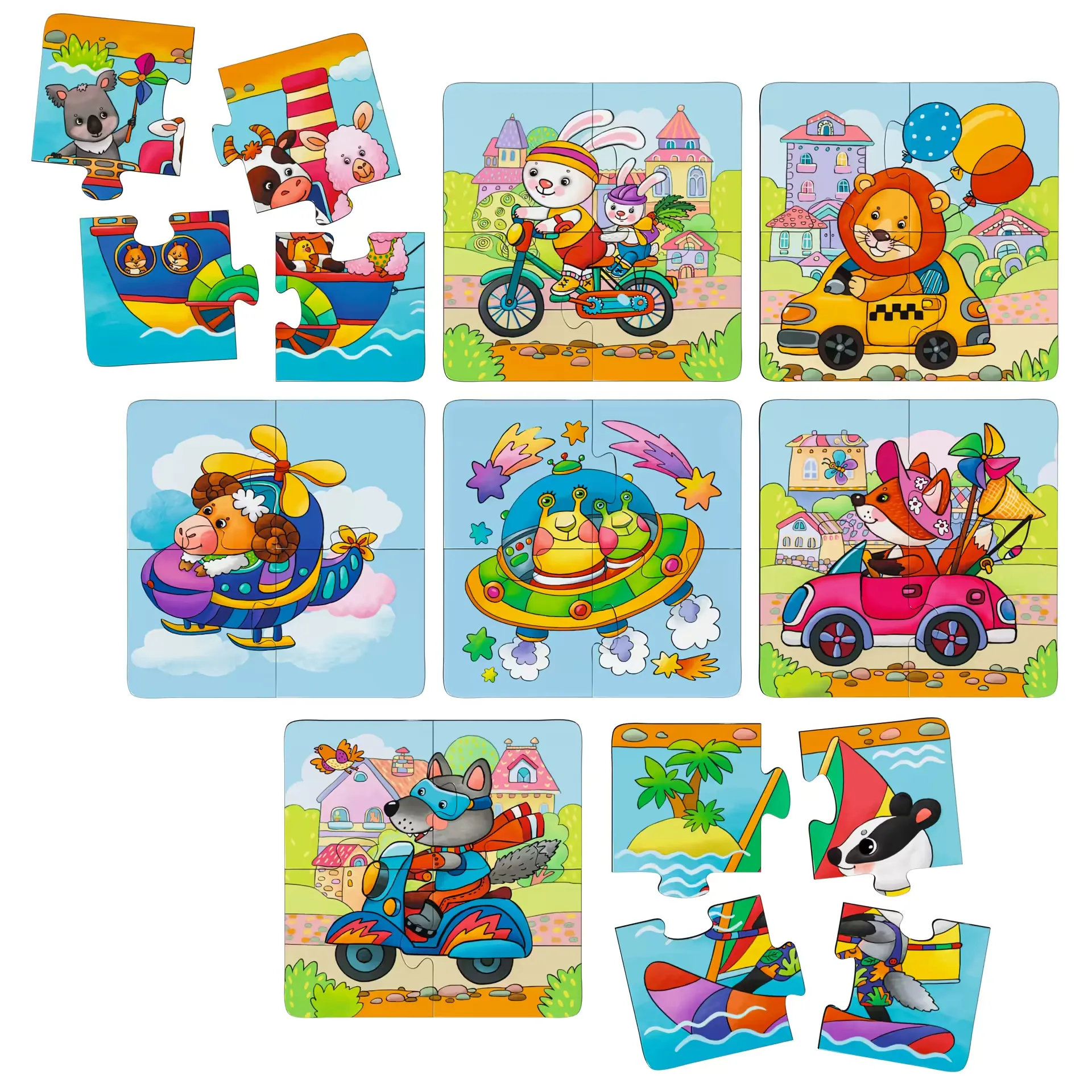 В этом наборе собрано восемь изображений забавных животных-путешественников на разных видах транспорта. Картинки складываются из четырёх частей. Игра разовьёт мелкую моторику, восприятие, внимание, пространственное мышление. В шпаргалке даны рекомендации для родителей.
