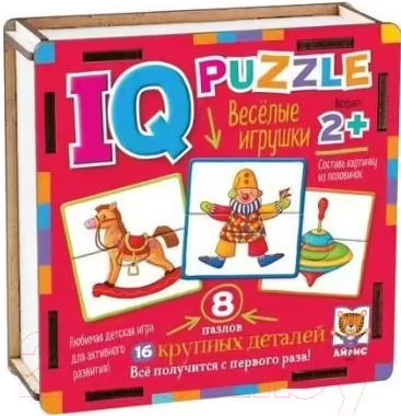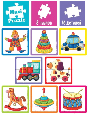 В этом наборе собрано восемь изображений забавных игрушек. Картинки складываются всего из двух частей. Игра разовьет мелкую моторику, восприятие, внимание, пространственное мышление.