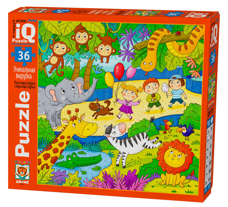 Пазл с изображением животных зоопарка состоит из 36 элементов. Размер картинки 32×32 см. Материал идеально подходит для детских ручек. Большие детали выполнены из плотного толстого картона. Благодаря этому они ровно лежат, замки легко соединяются и хорошо держатся. По тактильным ощущениям малыш сразу понимает, правильно ли он собрал пазл. Предназначено для детей от 3 лет.