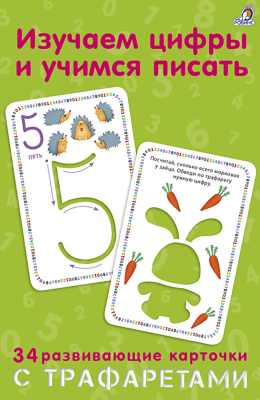 "Изучаем цифры и учимся писать" по трафаретам - это комплект, состоящий из 34 обучающих карточек с трафаретами и инструкцией: 10 карточек на каждую цифру, 1 карточка с математическими знаками и 22 карточки с животными.
