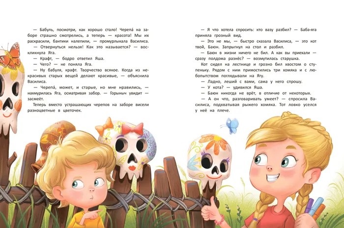 Что будет, если к Бабе-яге на каникулы привезут двух непоседливых внуков? Да всё что угодно! Вот чего точно не будет - так это скуки! Вас ждут незапланированные путешествия в необычном летательном средстве, почти художественная роспись по бабушкиному забору с черепами, случайно обнаруженные и опробованные волшебные пирожки, уборка в избушке на курьих ножках, полёты на Змее Горыныче (ни одно сказочное существо при полёте не пострадало) и другие весёлые приключения!