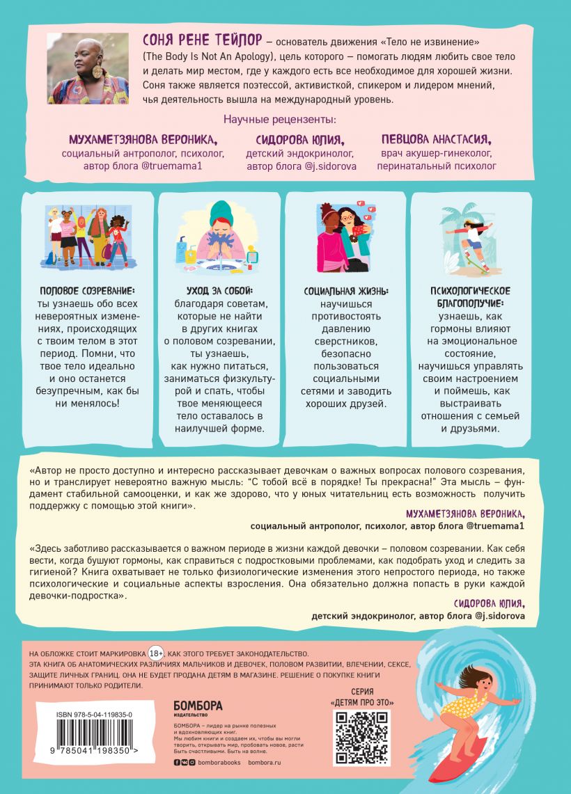Половое созревание. Звучит как гром среди ясного неба, не так ли? Тело меняется, и тебе нужны ответы, как с этим жить дальше. Первое, что нужно понять о взрослении, это то, что необязательно сразу знать все. Можно взрослеть постепенно. Автор книги, Соня Рене Тейлор, постаралась заранее ответить на все вопросы, которые у тебя могут возникнуть. - Что такое половое созревание и чего следует ожидать в этот период? - Как развивается тело девочки? - Как правильно ухаживать за собой? - Перепады настроения и новые чувства — что с этим делать? - Питание и спорт — есть ли особые рекомендации? На обложке стоит маркировка 18+, как этого требует законодательство. Эта книга об анатомических различиях мальчиков и девочек, половом развитии, влечении, сексе, защите личных границ.