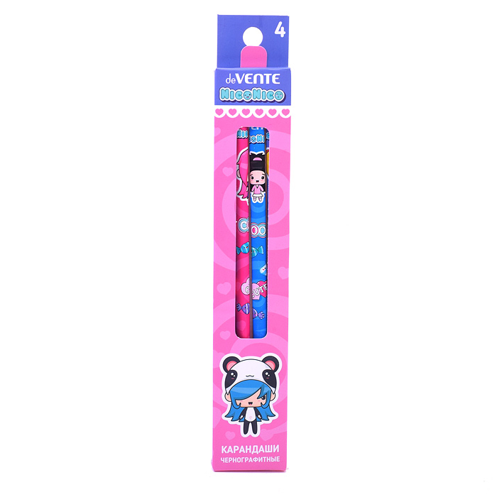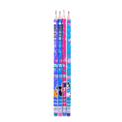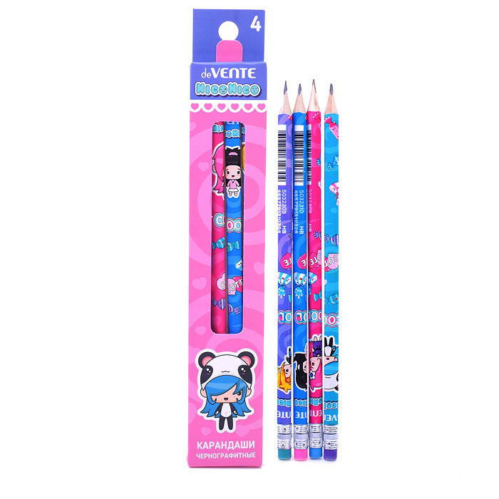 Карандаш чернографитный "NicoNico:-)" 04 шт (HB) диаметр грифеля 2 мм, трёхгранный корпус с запечаткой, дизайны ассорти, с ластиком, заточенные, в картонной коробке