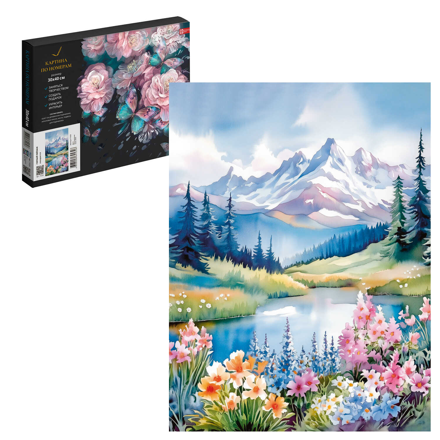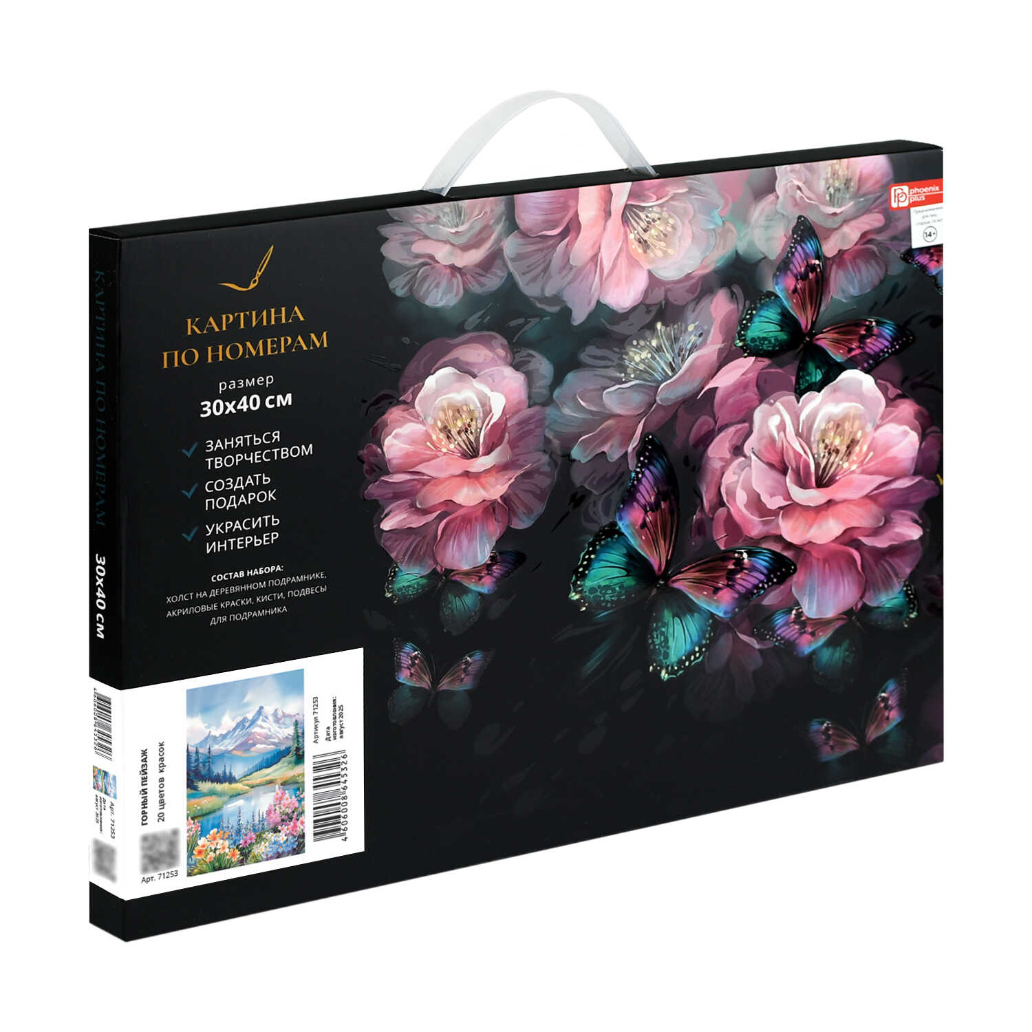Набор для творчества Картина по номерам арт. 71253 / 24 ГОРНЫЙ ПЕЙЗАЖ, размер: 30х40 см, холст на деревянном подрамнике с напечатанной схемой рисунка, контрольный лист с нанесенной схемой, краски акриловые на водной основе (упакованы в вакуумную упаковку), кисти художественные с ворсом из нейлона – 4 шт., подвесы для подрамника, пакет на zip-молнии, лак в комплекте, картонная коробка с ручкой)