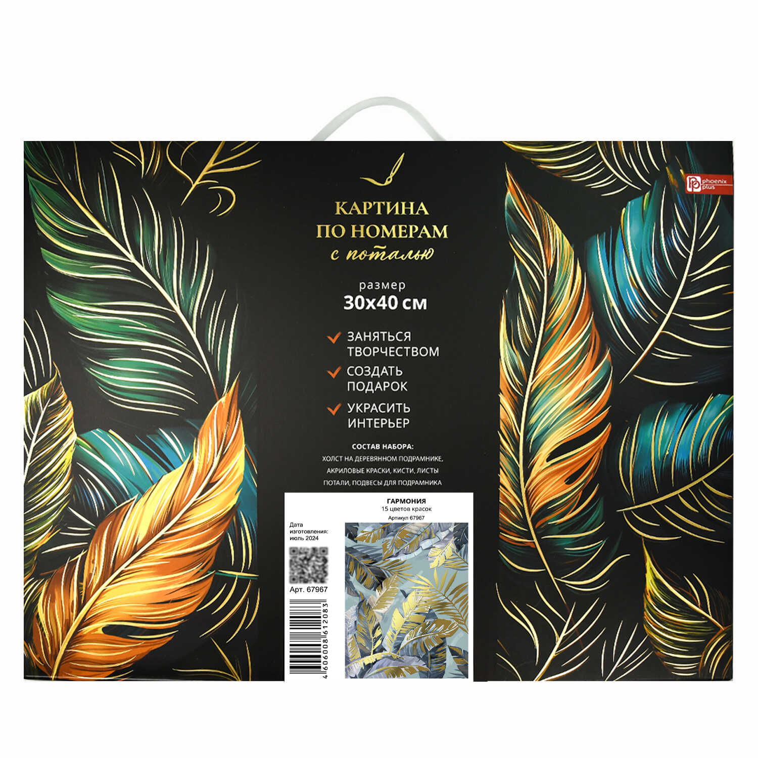 Набор для творчества Картина по номерам с поталью арт. 67967 / 25 ГАРМОНИЯ, размер: 30х40 см, (14 цвета (-ов), холст на деревянном подрамнике с напечатанной схемой рисунка, краски акриловые на водной основе (упакованы в вакуумную упаковку), кисти художественные с ворсом из нейлона – 4 шт., поталь, клей для потали, лак, пакет на zip-молнии, подвесы для подрамника, контрольный лист с нанесенной схемой в комплекте, поталь: медная, картонная коробка с ручкой)