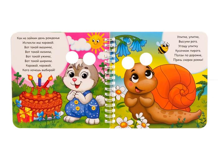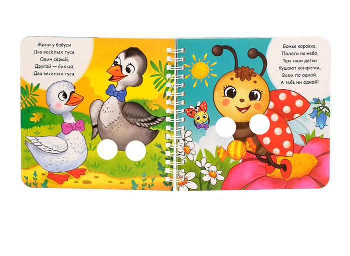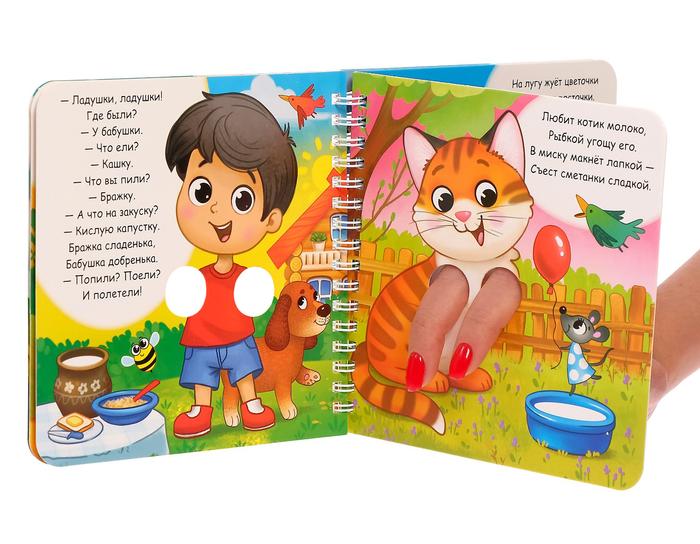 Картонная книга создана для весёлого чтения и игры. В ней есть специальные прорези для пальчиков, с помощью которых малыш может оживить картинку: сделать козе рожки или ушки зайчику. Читайте и играйте вместе с крохой!