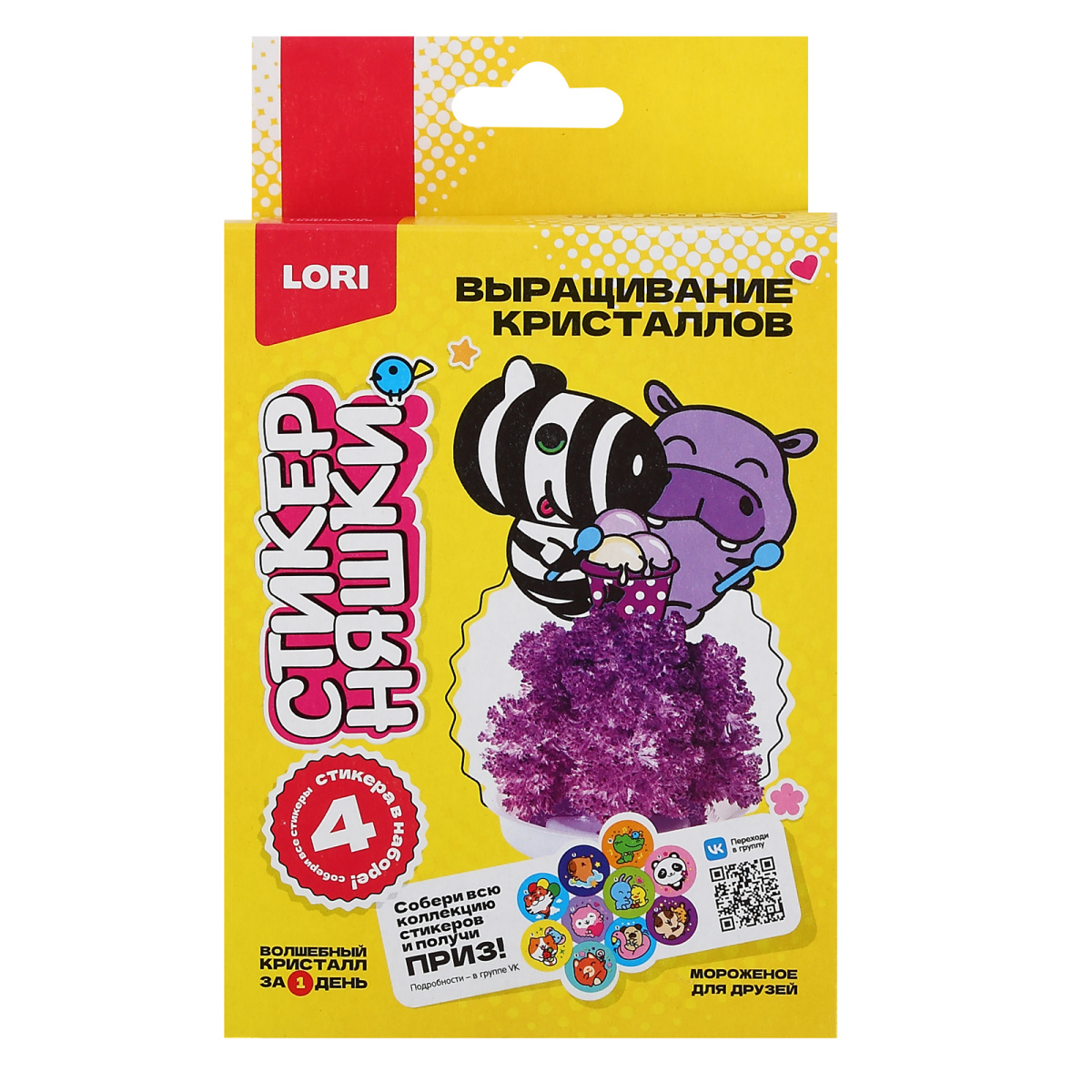 Выращивание кристаллов «Стикерняшки» — увлекательное занятие с милыми персонажами и фудовой тематикой. Так же в наборе есть милые стикеры. Химический опыт несложно провести, все необходимые комплектующие и реактивы уже входят в набор, поэтому никаких дополнительных материалов приобретать не нужно. Достаточно следовать инструкции, и кристалл начнет расти в этот же день. Благодаря набору ребенок сможет получить знания о том, как протекает химическая реакция кристаллизации веществ.